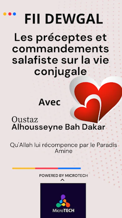 This application is an opportunity for those who yearn for a better married life. It gives opportunities to be equipped with teachings, principles, techniques and values allowing everyone to find a husband or wife who can bring happiness. In this application called Fii Dewgal, married life is taught by Oustaz Alhousseyne Bah Dakar. May Allah reward him with Paradise. How to find the right person? how to preserve the agreement in the couple? or how to live happily with your spouse? many other questions are detailed which will allow you to live a good life without breaking Islamic rules. The content is broadcast in the Poular language.