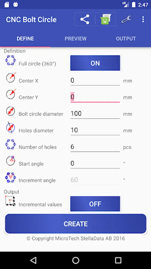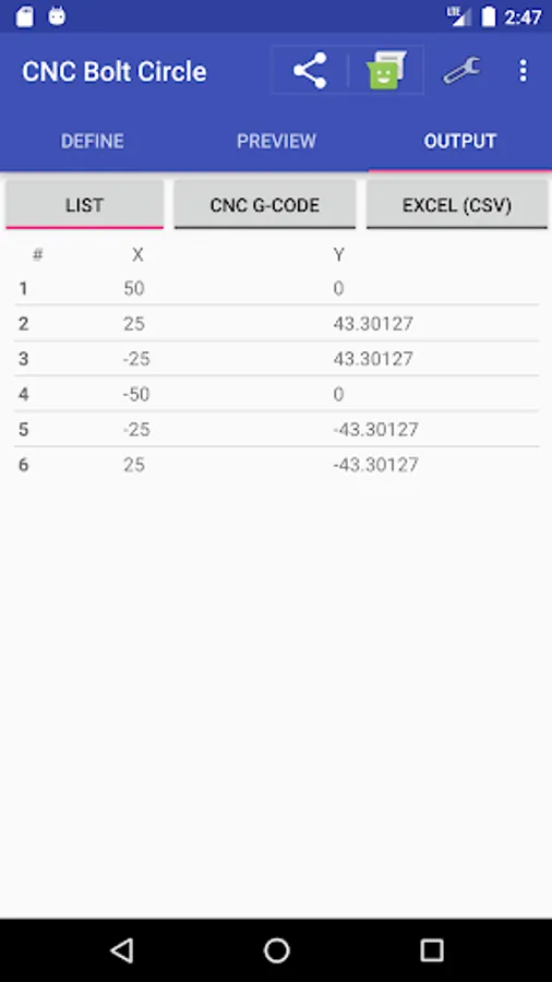 Ever felt the need to quickly calculate a bolt circle at the machine on the shop floop? This app will make it easy for you as a calculator. Easy to use and multiple possible outputs, including a simple point list, CNC g-code formatted list (Fanuc, Haas, Siemens compatibel) and Excel compatible CSV file.