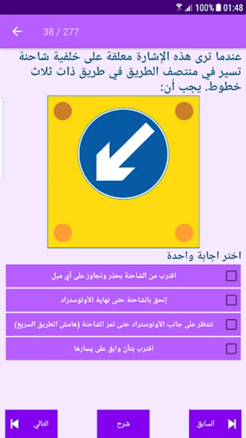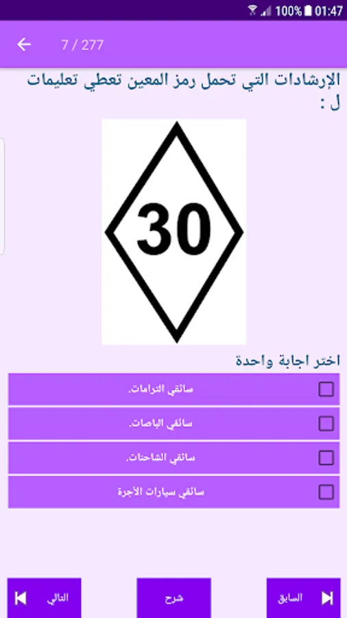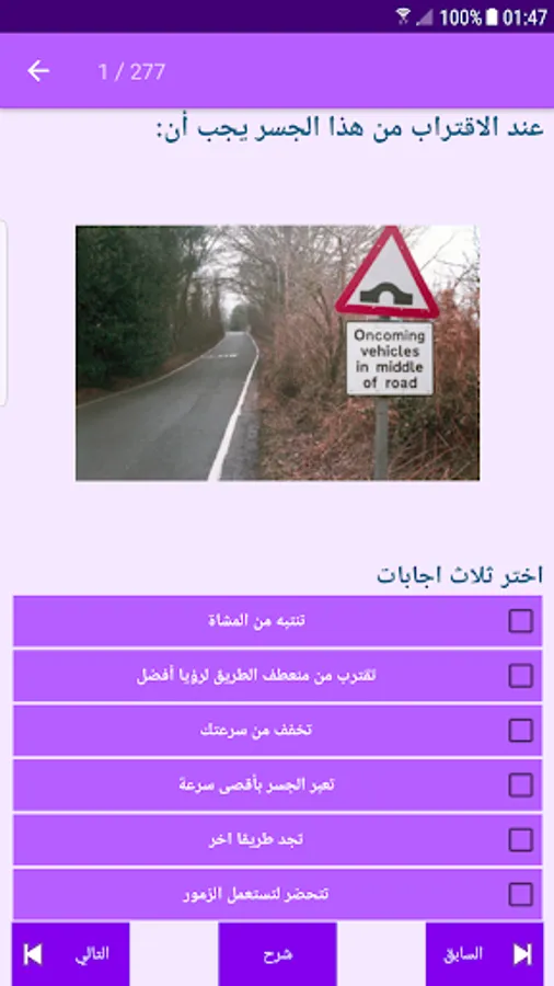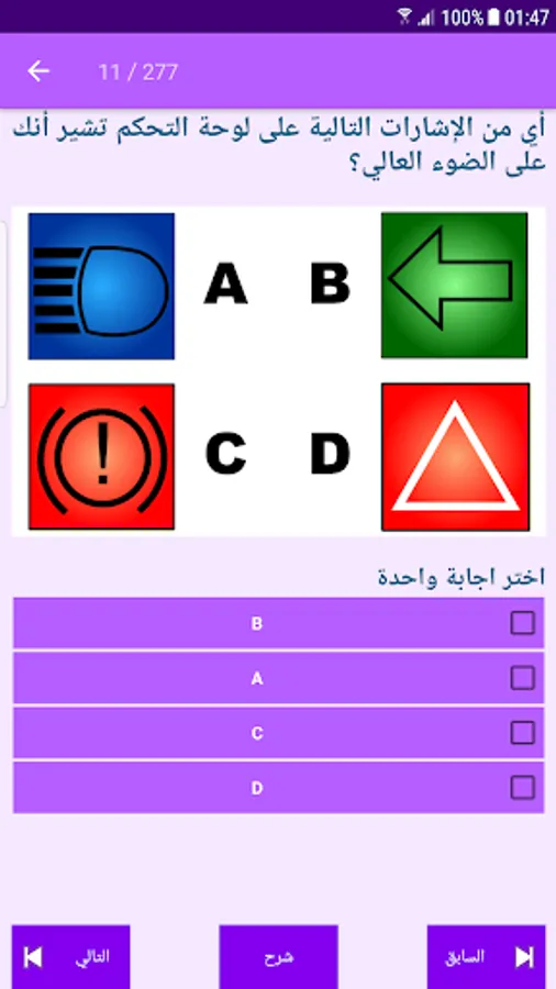 أكثر من277 سؤال وصورة. كما ويمكنك اجراء عدد لا متناهي من الاختبارات التجريبية قبل الامتحان ومعرفة الاجوبة الخطأ التي قمت بها.