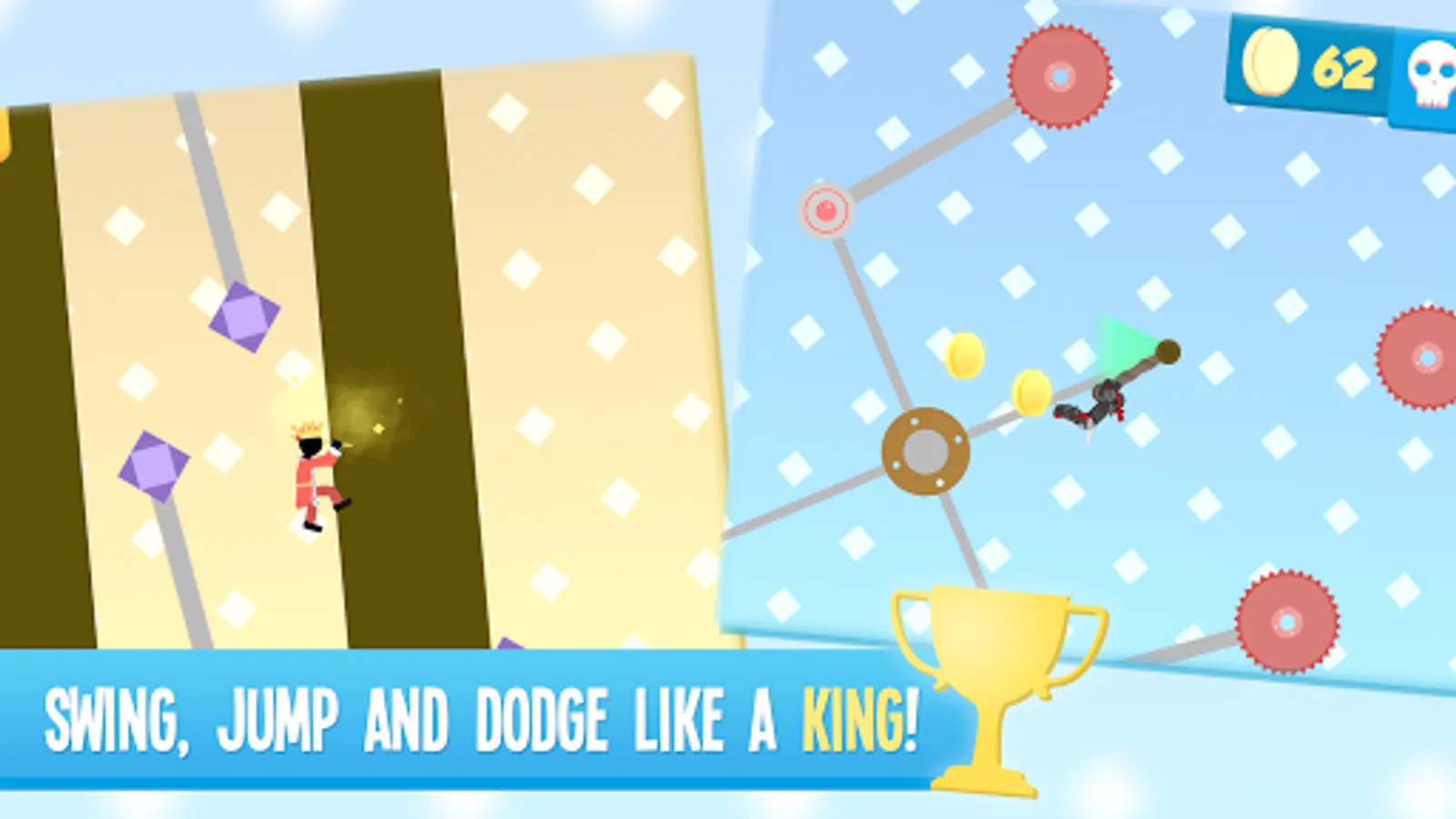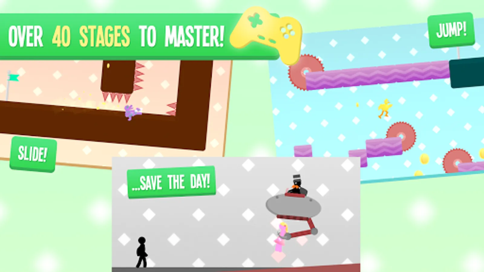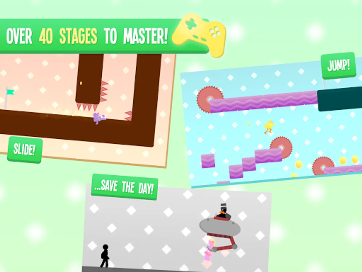 - Race through 40 different stages using parkour and fast reactions.