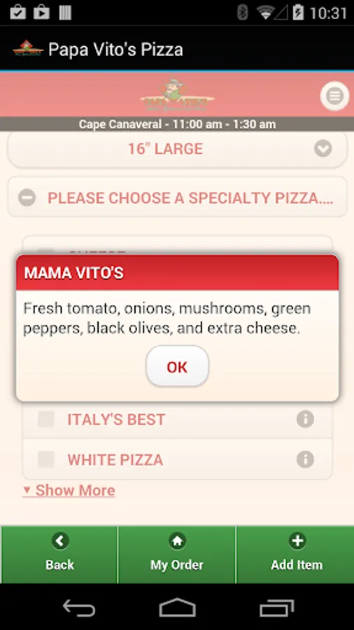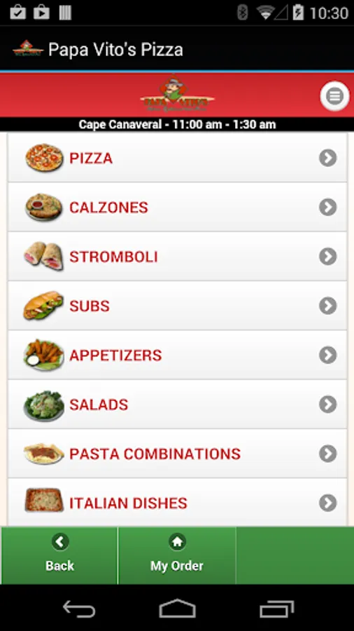 Papa Vito's Pizza is locally owned and operated. We have been proudly serving Cape Canaveral since 2001. Our menu includes the finest pizza, chicken wings, Italian entrees, submarines, salads, and the most talked about, delicious, house-made garlic knots. Enjoy our dining room, and our full menu can be delivered fresh to your home or office every day starting at 11:00a.m. 365 days a year.