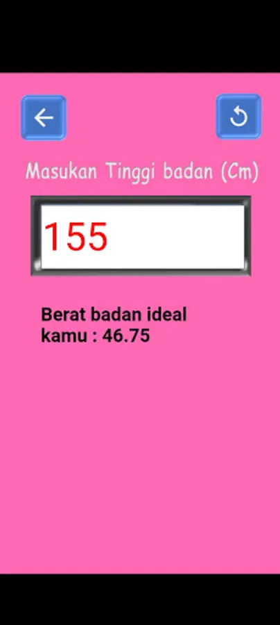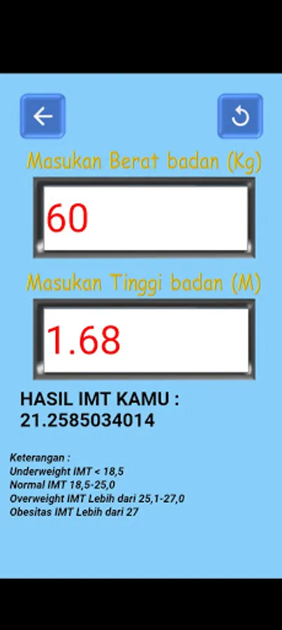 This application can find out your weight quickly, weight according to gender and according to the BMI calculation of body mass index, the formula used in this application is in accordance with WHO guidelines. To find out more information, visit the WHO official website.