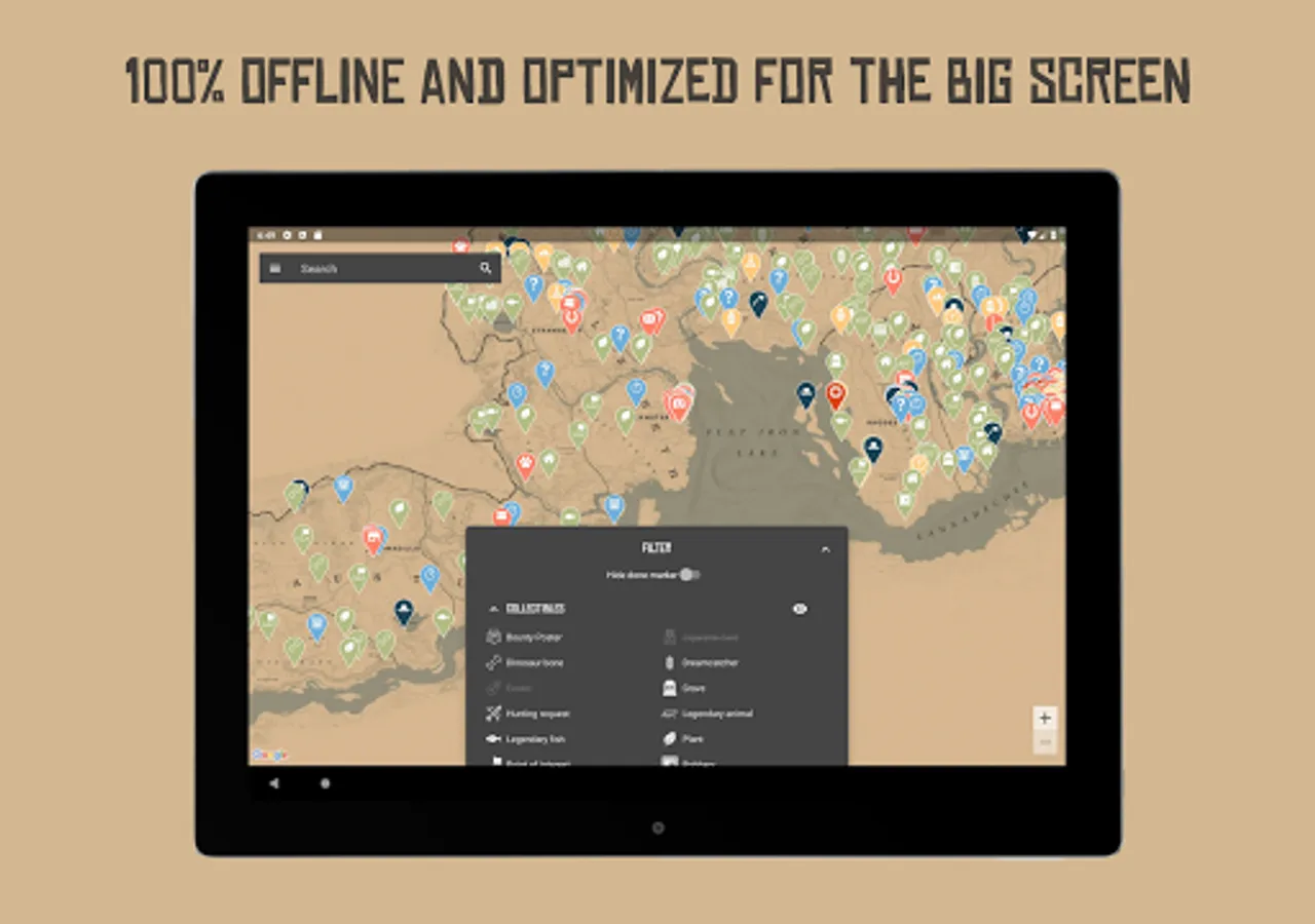 The unofficial map for RDR2 helps you to stay ahead of the game. Don't know where to find the next shop? What items you already collected? What interesting things to explore? The most extensive RDR2 Map app is here to help. Made by fans for fans - and the best thing: 100% offline!