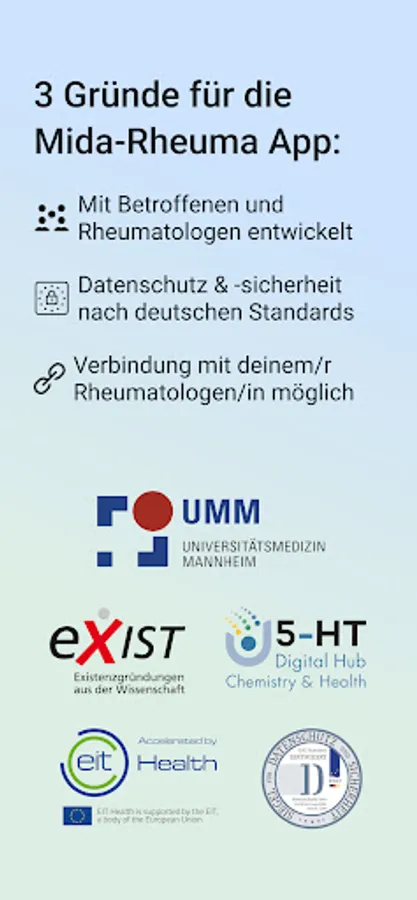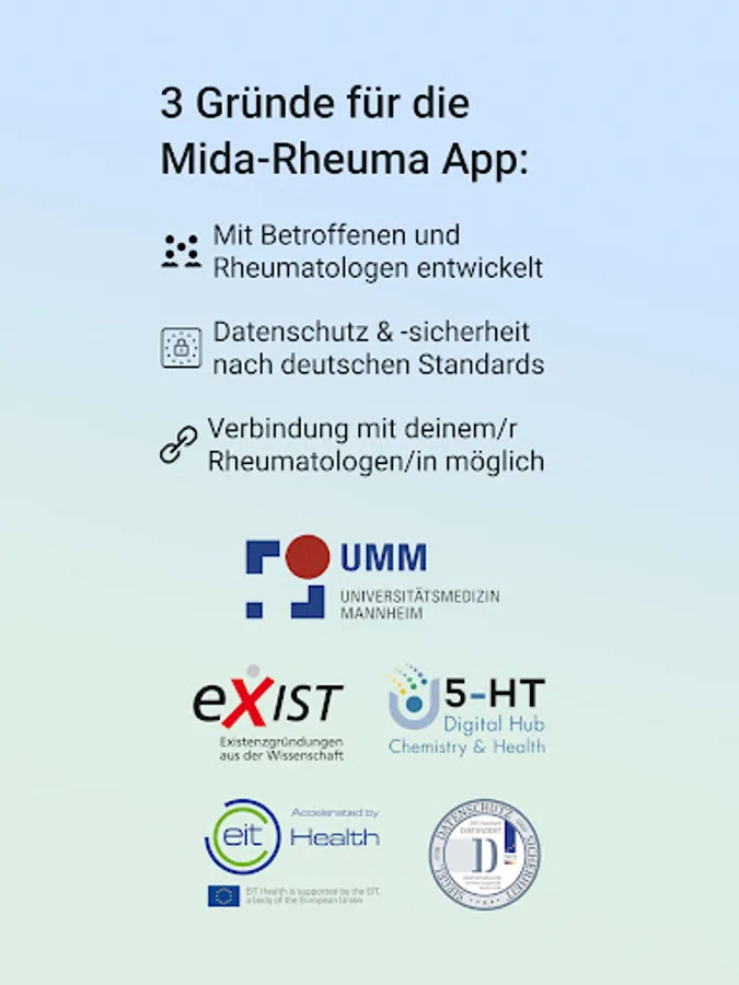 The Mida Rheuma App is a certified class I medical device. We apply European data protection regulations to protect your privacy and protect your data.