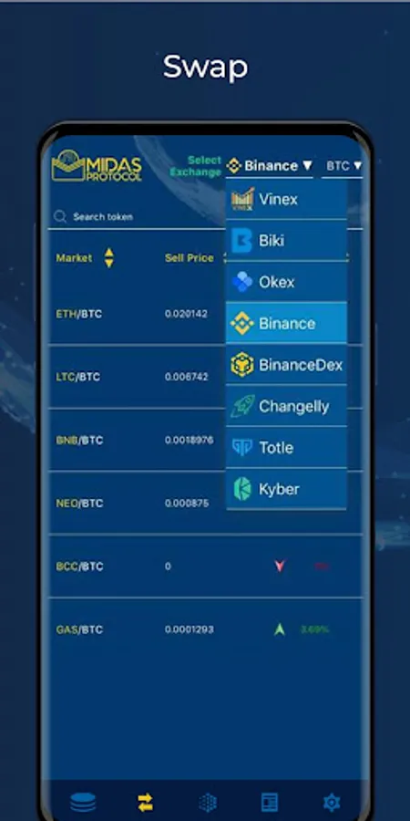 Midas Protocol wallet is a crypto wallet that was designed for mobile users, allowing them to send, receive, and store crypto and tokens. It also allows access to DApp and both centralised and decentralised exchanges in the same app. Among the exchanges that can be accessed includes Binance, Biki, OKEX, Kucoin, Changeally, Totle, Kyber and Binance DEX.