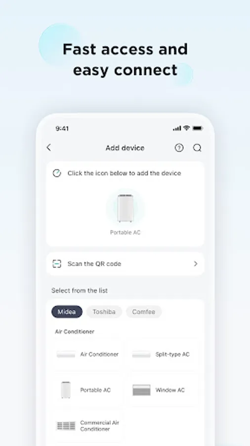- Camera: Scan QR codes to add device. Upload photo to report a repair or feedback.