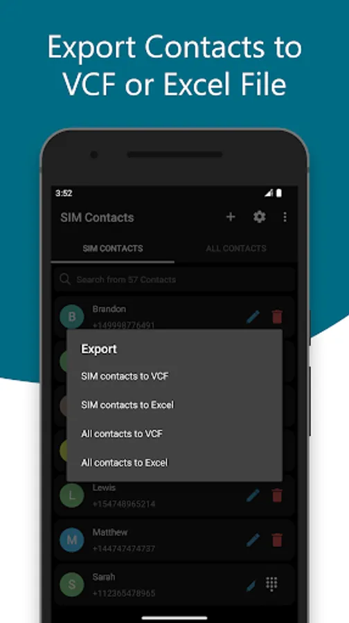 You can export SIM contacts & device contacts to an Excel sheet or VCF.