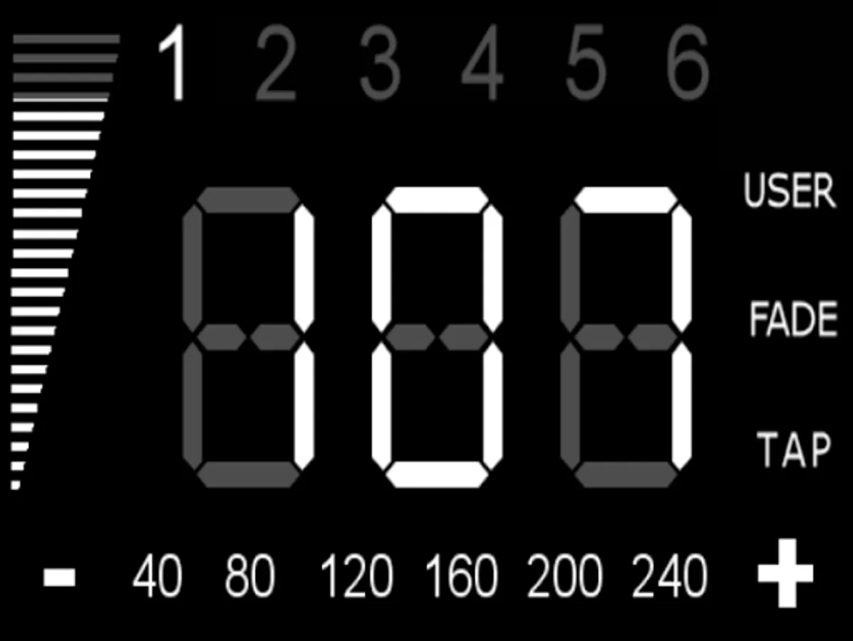 Digital metronom for 1/4 to 6/4 styles. Adjustable tempo from 40 to 240 bpm.