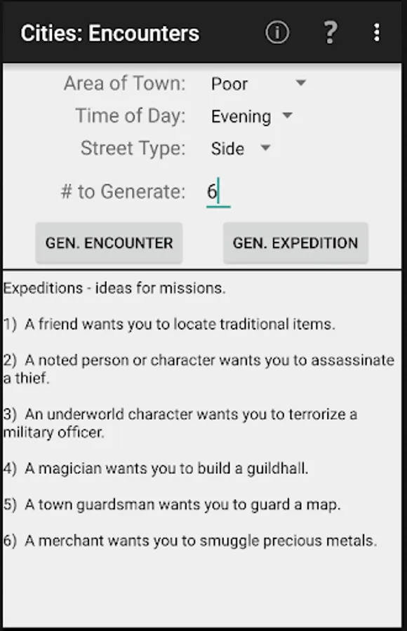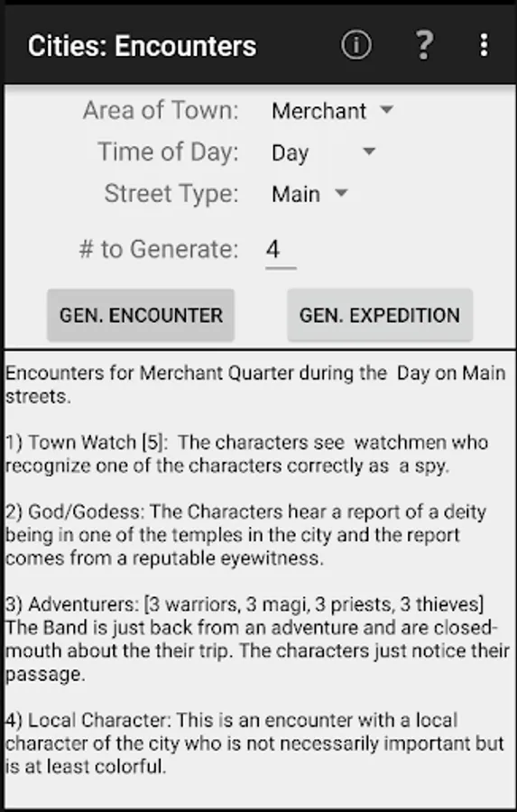 The free version limits you to generates one encounter at a time tailored for the Merchant Quarter during the Day and on Main streets. For just $0.99 you can upgrade with an in-app purchase and generate multiple encounters at once using all the combinations of Area of Town, Time of Day, and Street type.