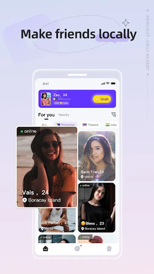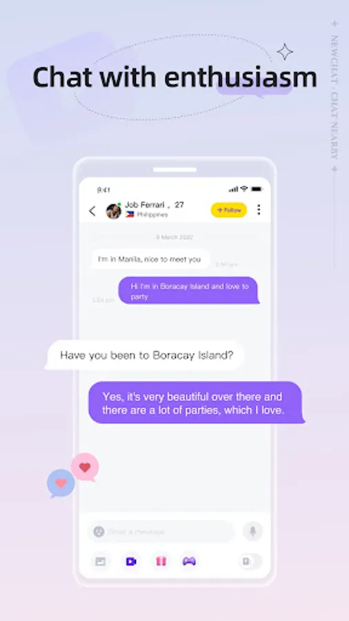 Newchat is a 1-on-1 online video chat app that allows you to chat with people nearby. 1-on-1 online video and a completely private chat environment make chatting stress-free. Real-time translation helps you chat without burden. Start interacting with strangers now!