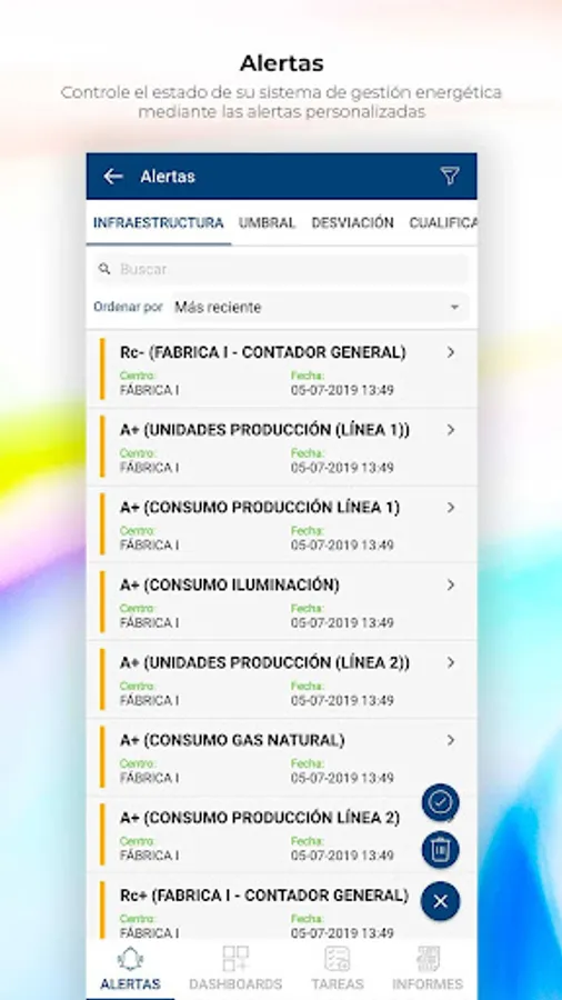 Alerts Responding quickly to an alarm can generate big savings. Has an energy meter stopped communicating? Has the cost of a period exceeded the budget? Is consumption deviated from what it should be? With the app you will be continuously informed of when, where and why an event is taking place and you can take action.