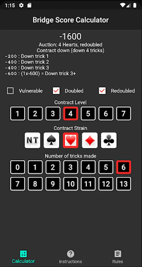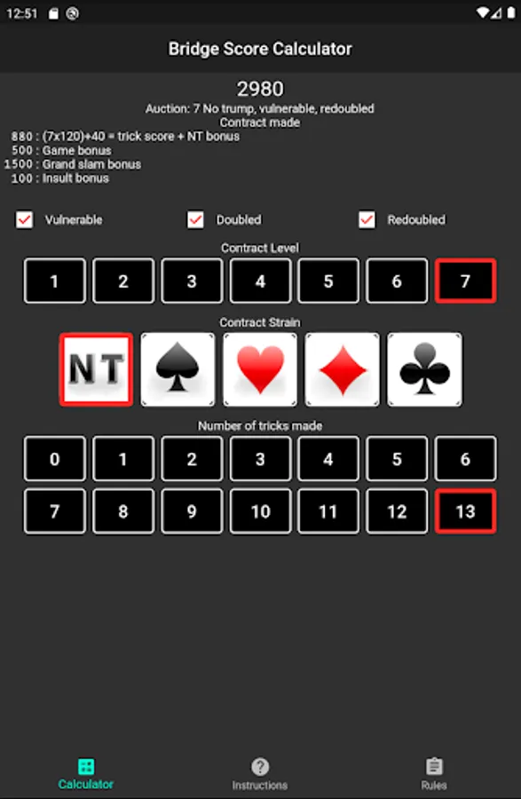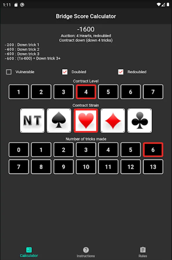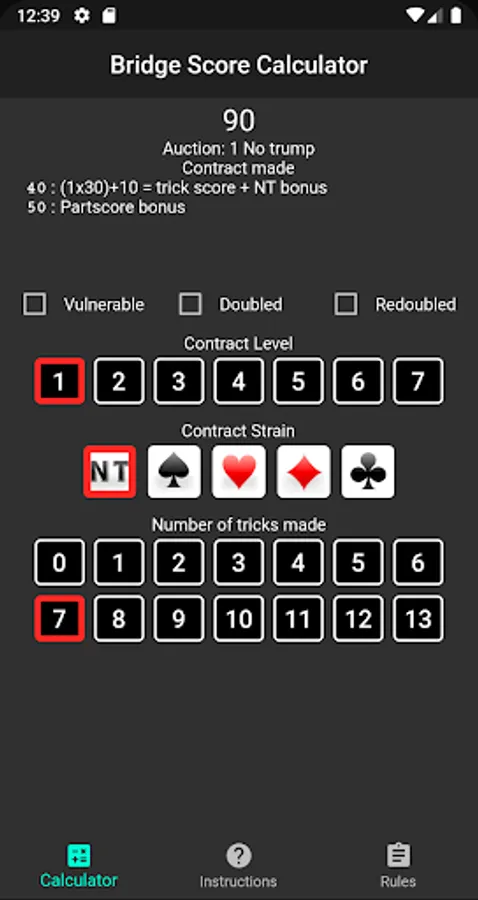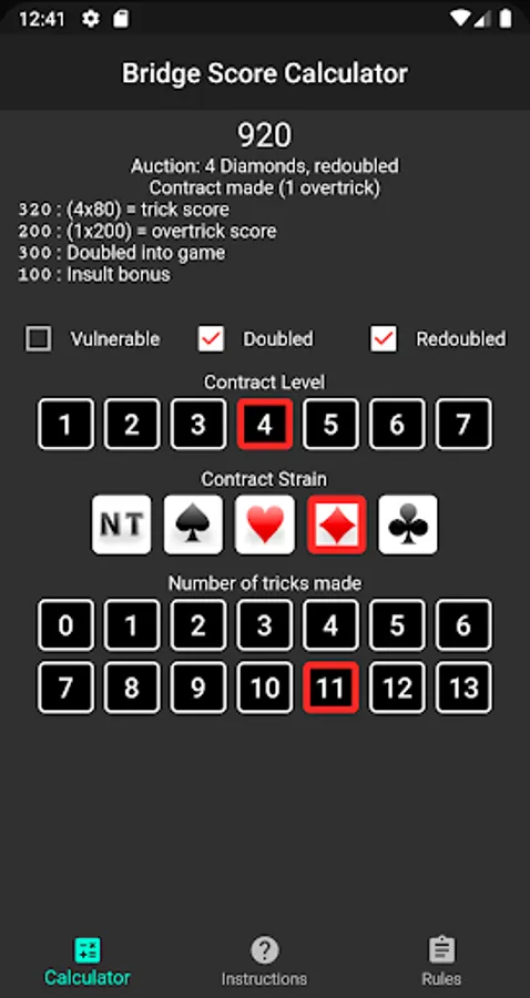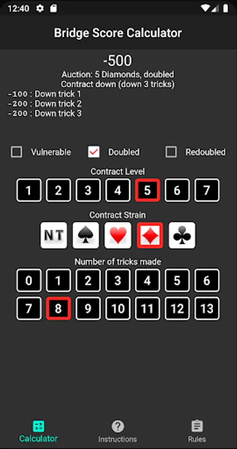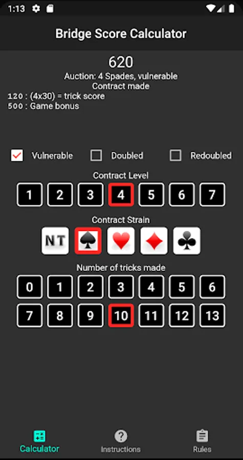 With this convenient app you can calculate your bridge score with three or more clicks of the button or quickly compare your score to the opponent's potential score to see whether you should make a sacrifice bid, even if they double your contract.