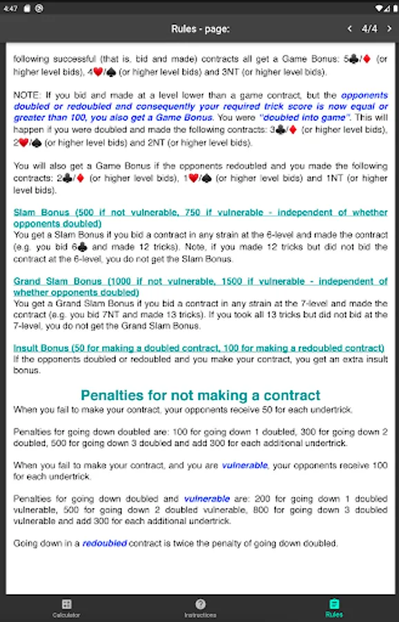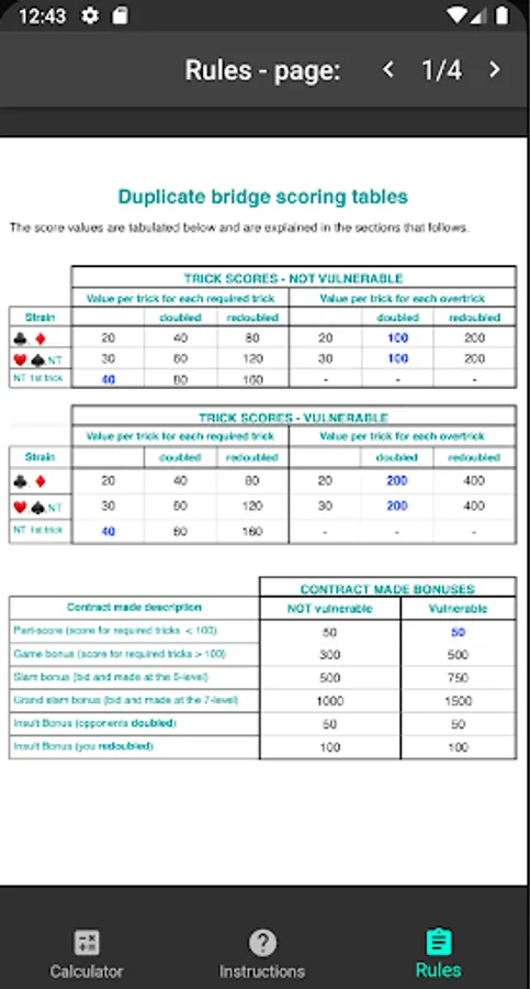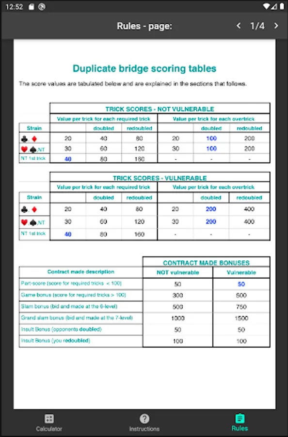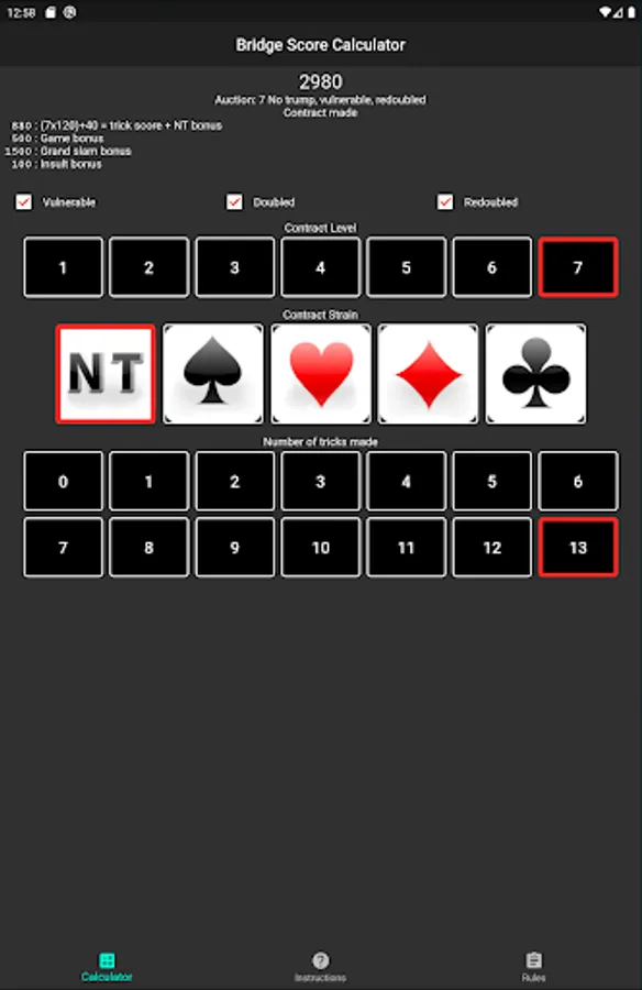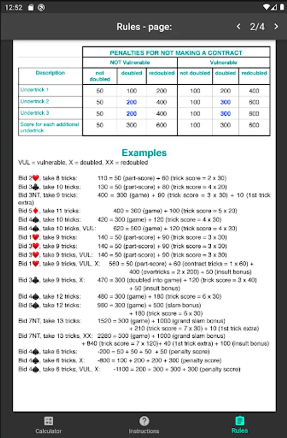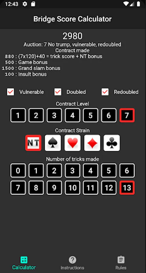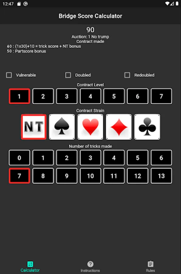 With this convenient app you can calculate your bridge score with three or more clicks of the button or quickly compare your score to the opponent's potential score to see whether you should make a sacrifice bid, even if they double your contract.