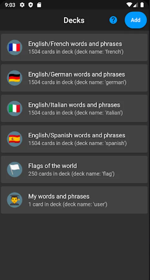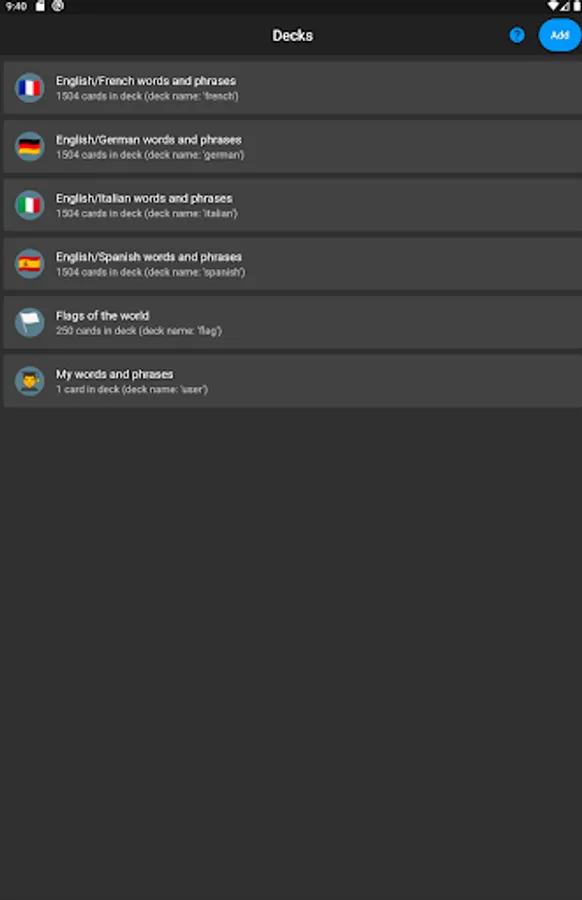 There is also a pre-loaded deck of 250 flags of nations and territories of the world (on some devices, the emoji for the flag might not be visible) and also a user deck where you can add your own new words or phrases.
