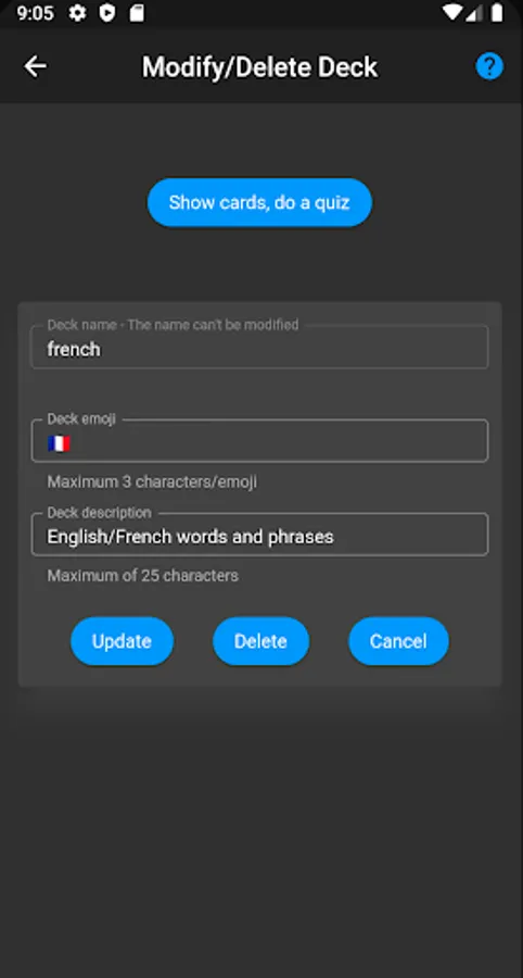 You can add or modify a deck or add and modify cards in a deck. Therefore, the application has all the capabilities of a flashcard maker.