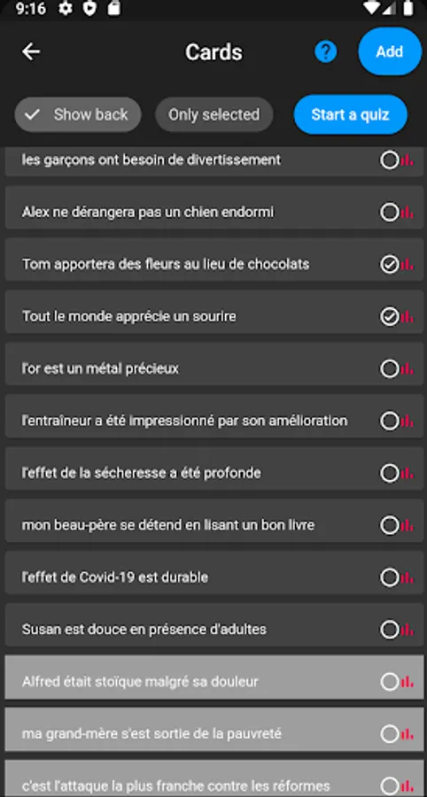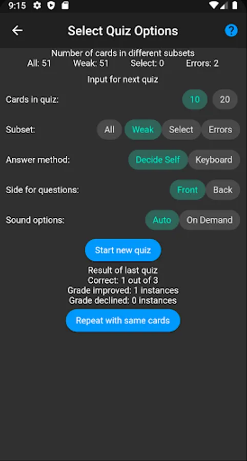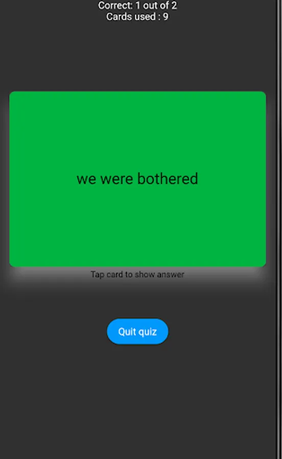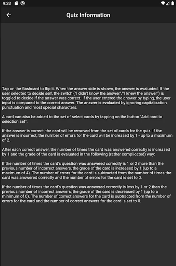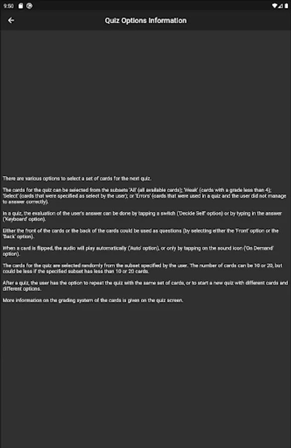 A grading system is incorporated whereby cards that were translated correctly in the quizzes get a higher grade. The user should repeat the quizzes to get as many as possible cards at the highest grade.