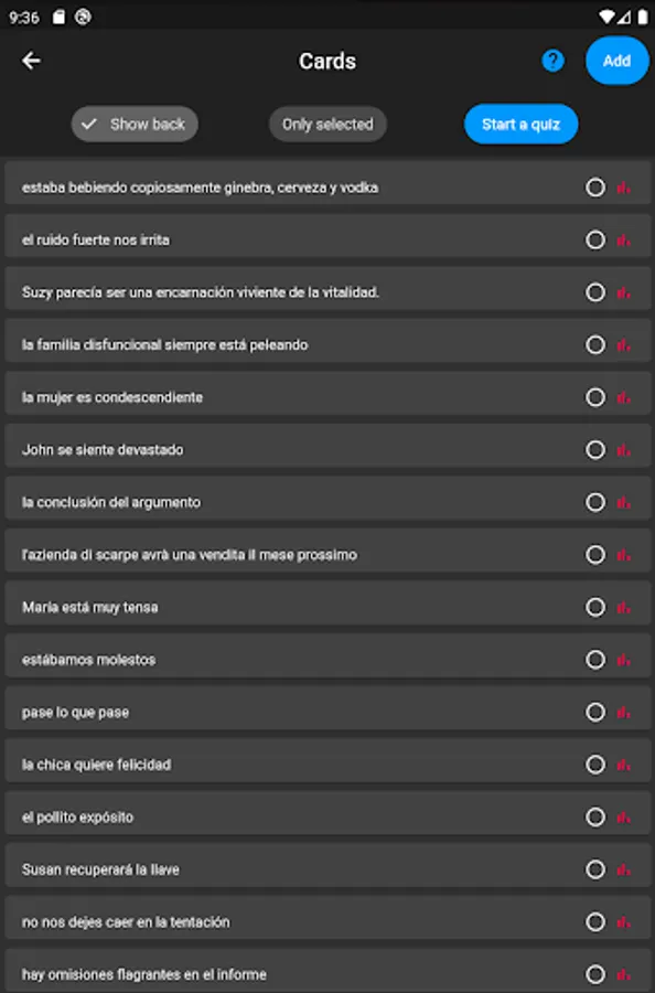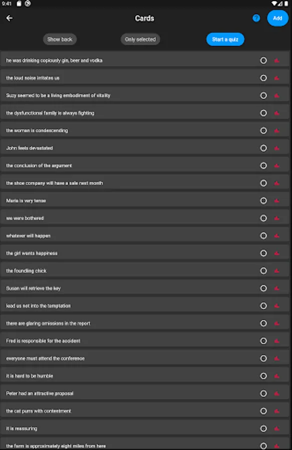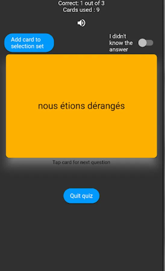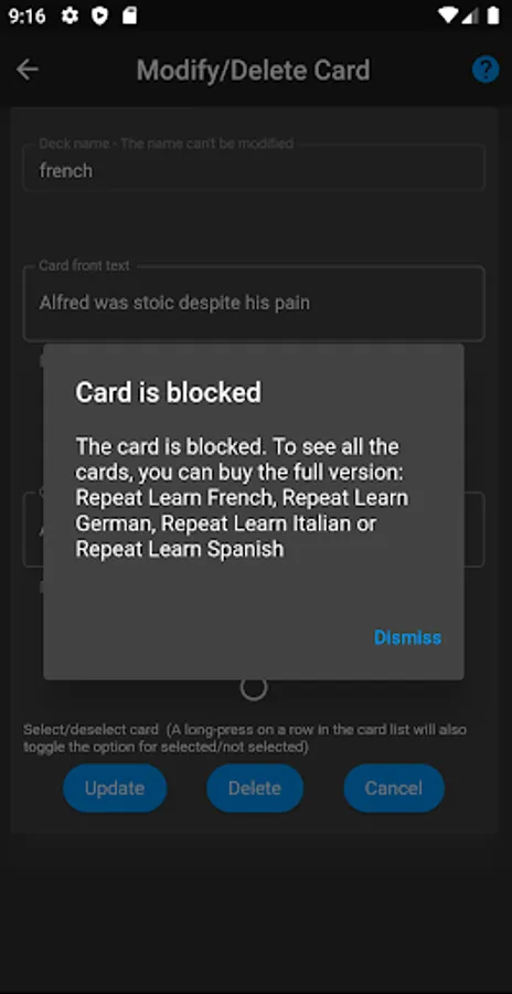 For this demo version, only 50 cards for each language deck can be used in the quizzes. To get the version for a language with all the capabilities and all the audio, search for the full version in the "Repeat Learn" series on the play store.