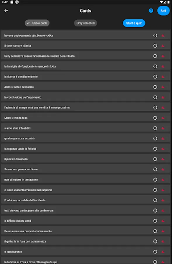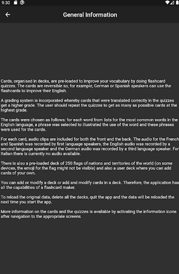Cards, organised in decks, are pre-loaded to improve your vocabulary in French, German, Italian or Spanish by doing flashcard quizzes. The cards are reversible so, for example, Spanish speakers can also use the flashcards to improve their English.