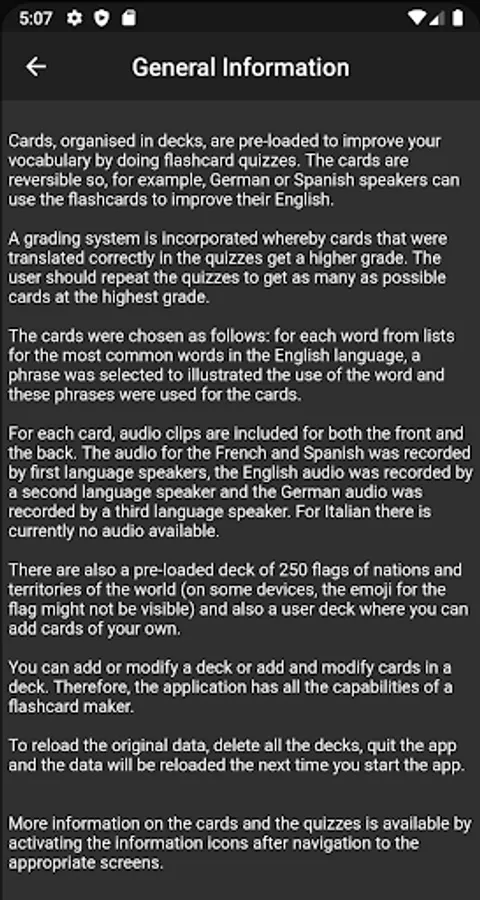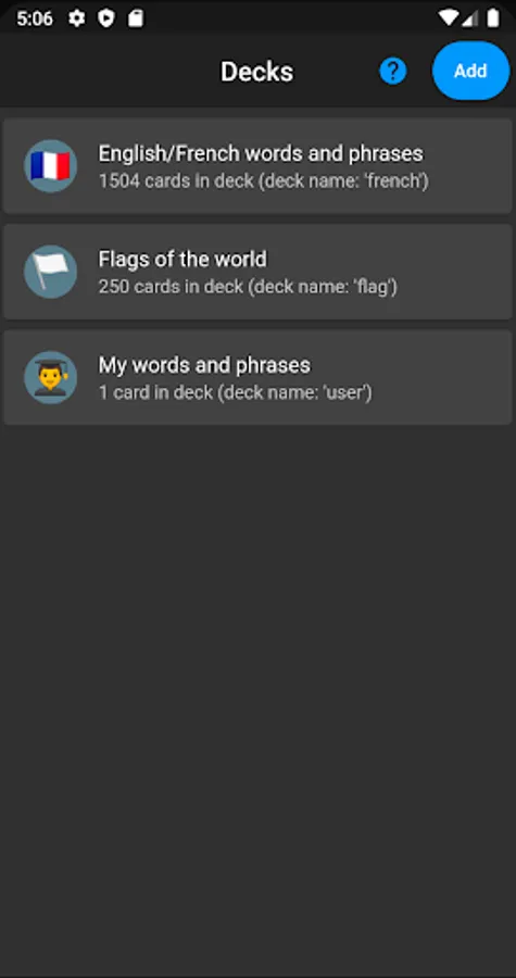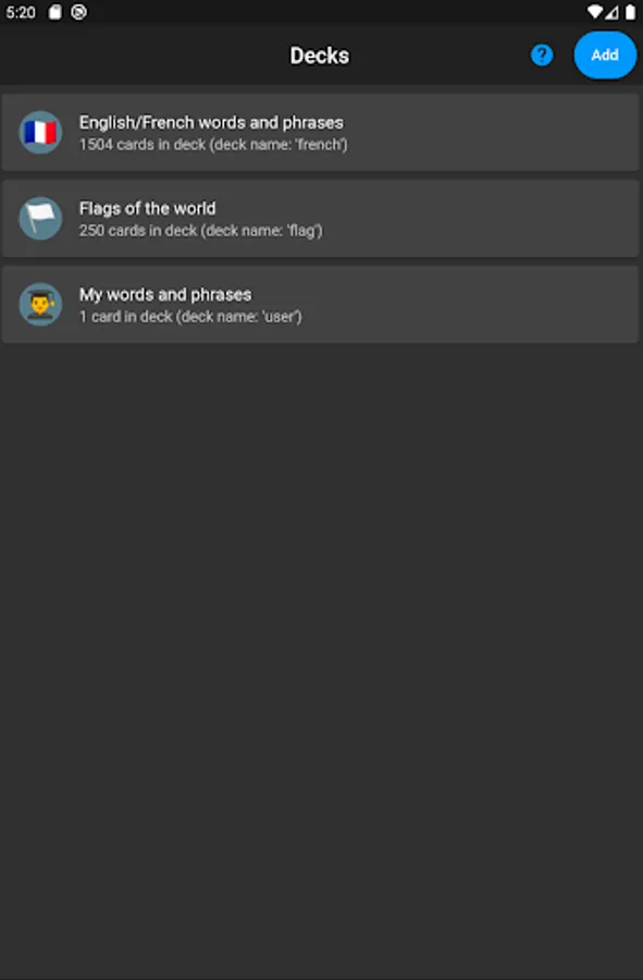 There is also a pre-loaded deck of 250 flags of nations and territories of the world (on some devices, the emoji for the flag might not be visible) and also a user deck where you can add your own new words or phrases.