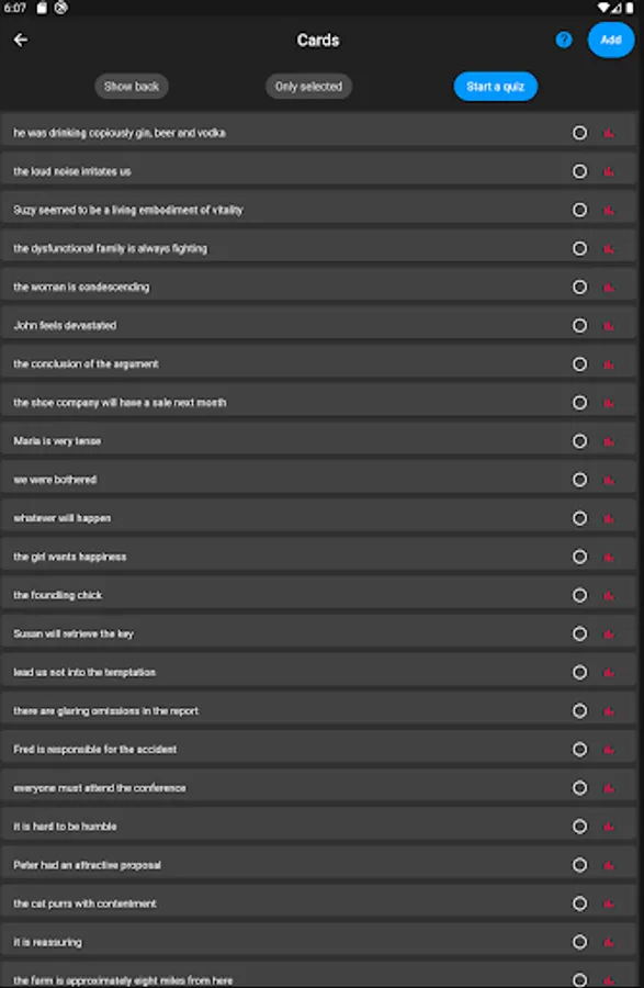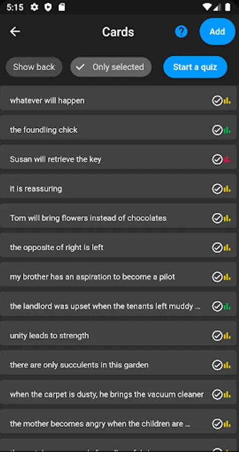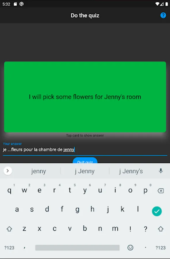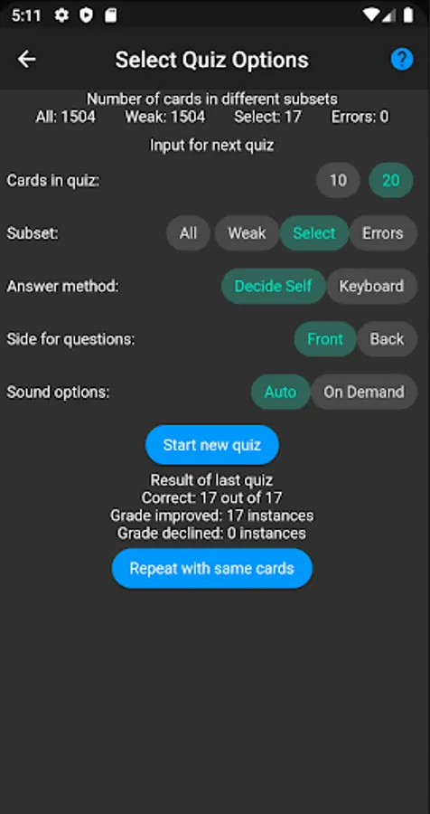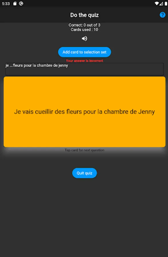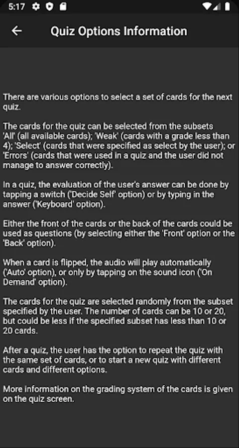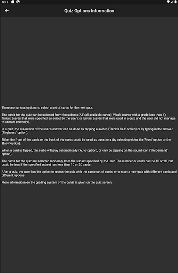 A grading system is incorporated whereby cards that were translated correctly in the quizzes get a higher grade. The user should repeat the quizzes to get as many as possible cards at the highest grade.