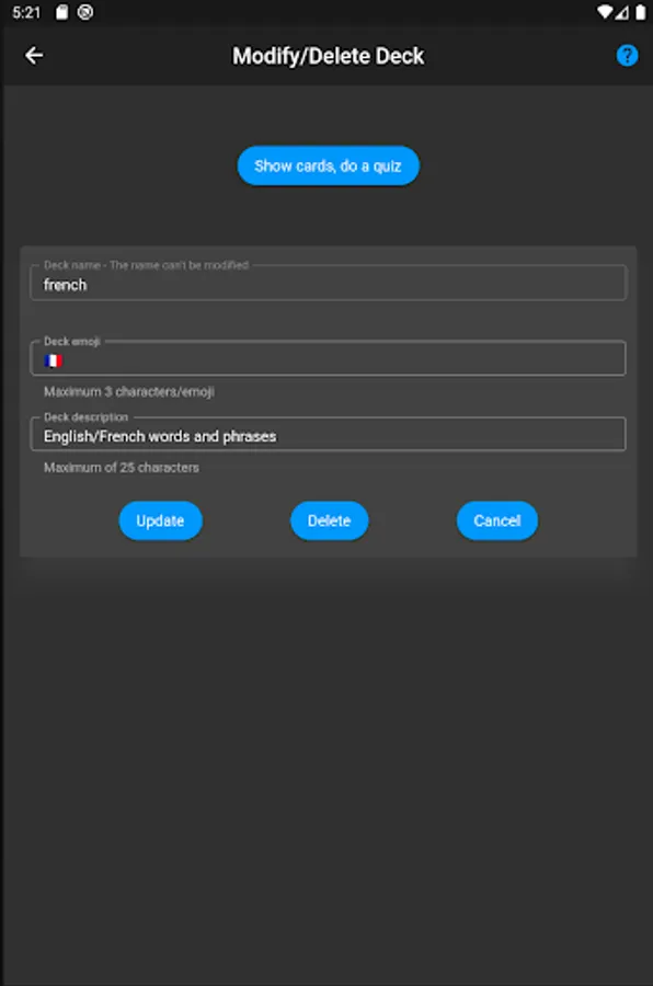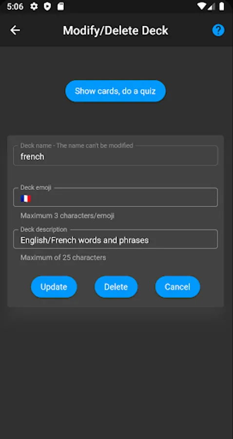 You can add or modify a deck or add and modify cards in a deck. Therefore, the application has all the capabilities of a flashcard maker.