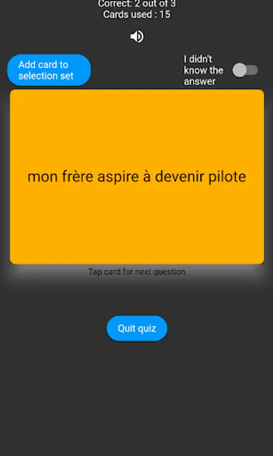 Cards, organised in decks, are pre-loaded to improve your vocabulary by doing flashcard quizzes. The cards are reversible so, French speakers can also use the flashcards to improve their English.