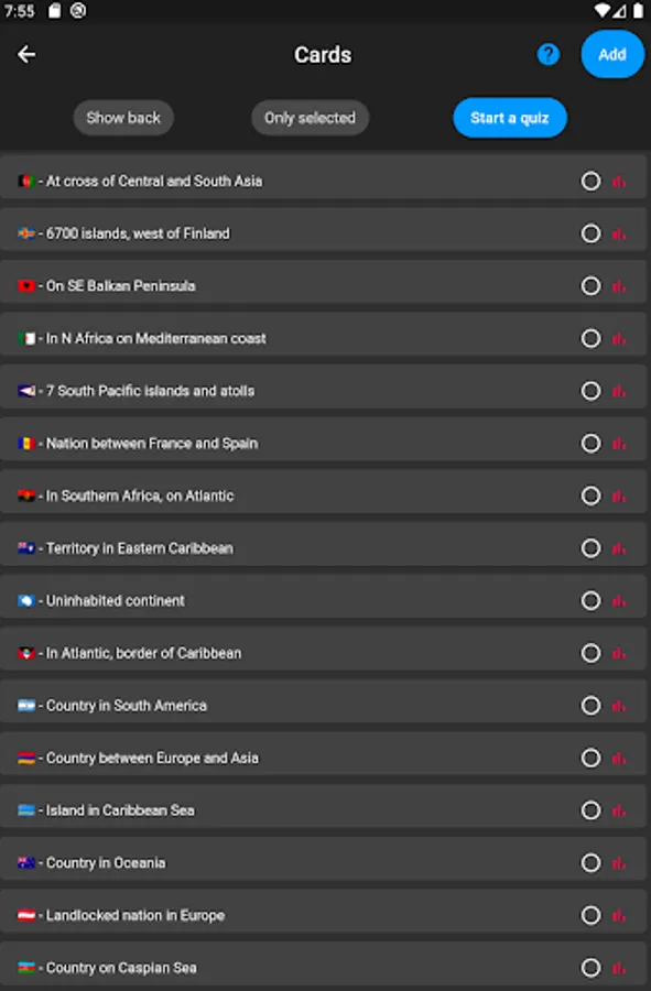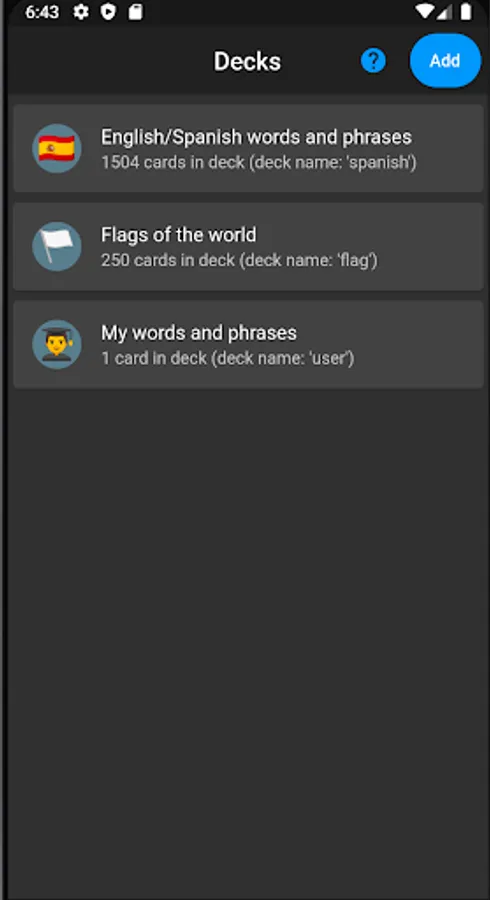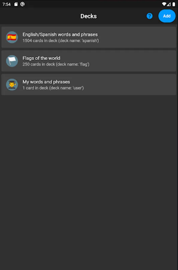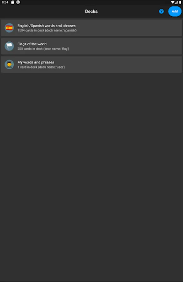 There is also a pre-loaded deck of 250 flags of nations and territories of the world (on some devices, the emoji for the flag might not be visible) and also a user deck where you can add your own new words or phrases.