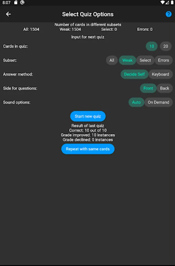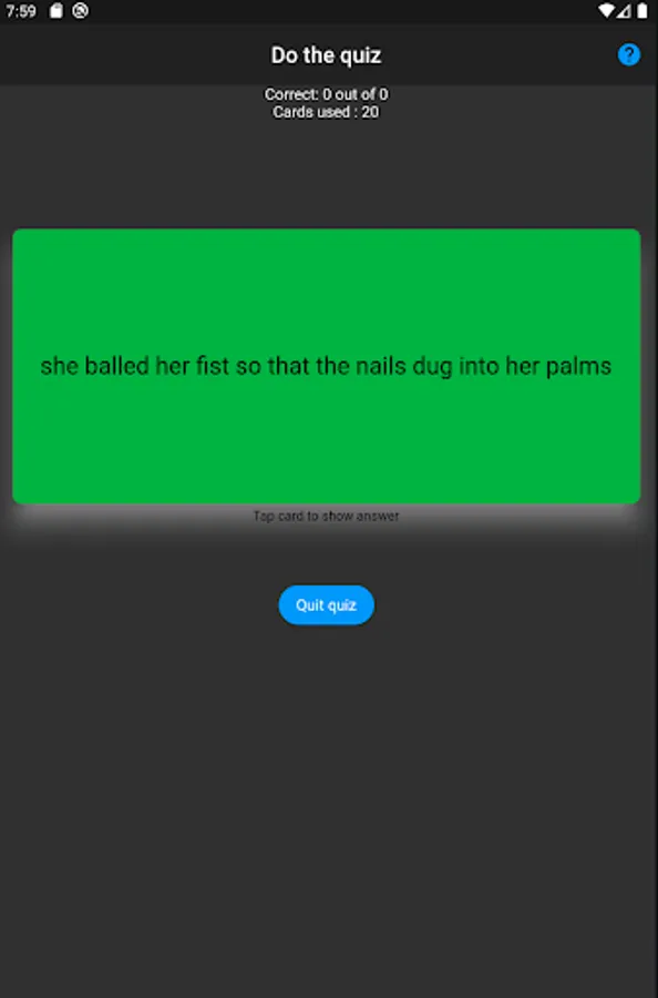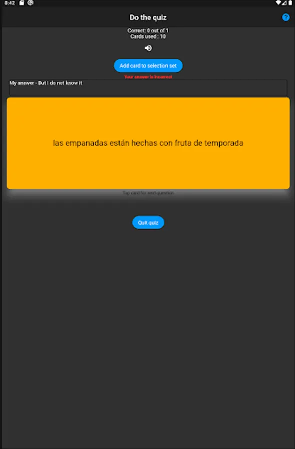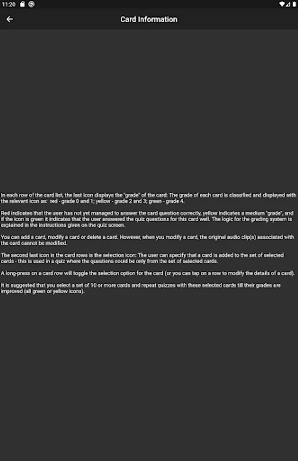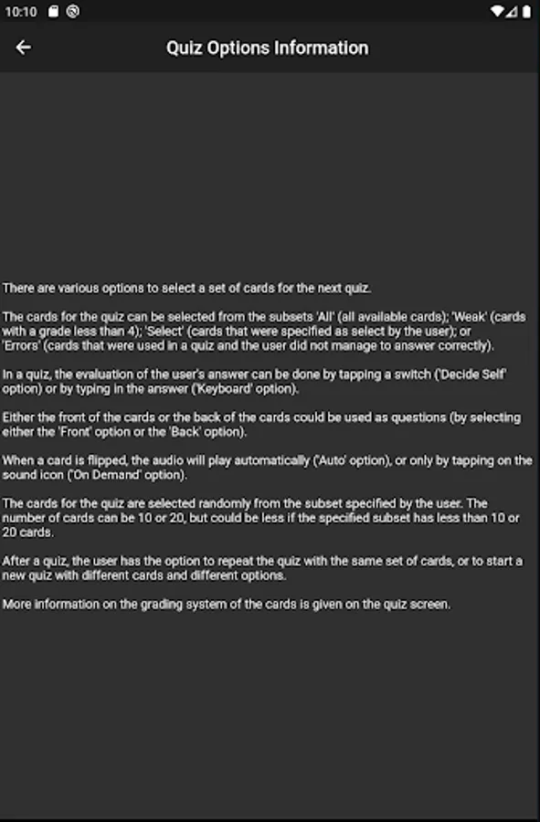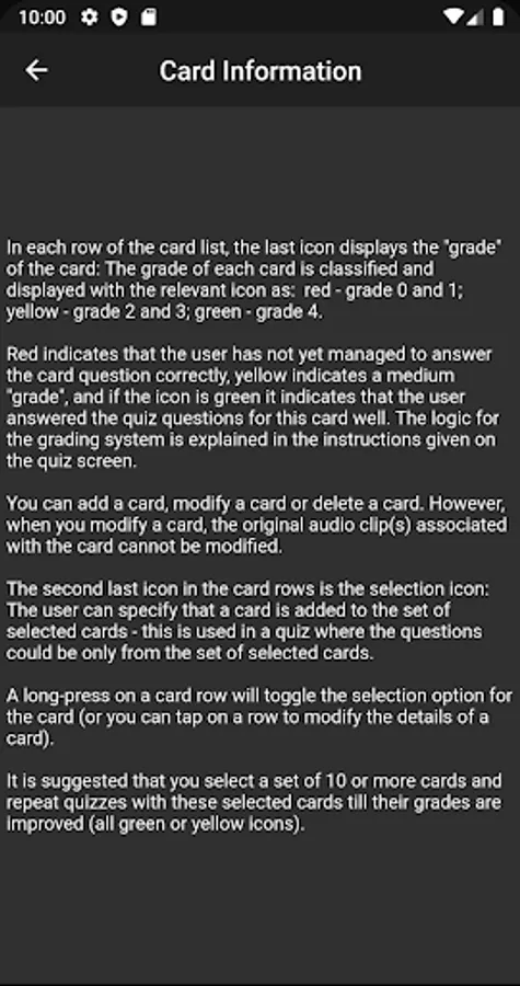 A grading system is incorporated whereby cards that were translated correctly in the quizzes get a higher grade. The user should repeat the quizzes to get as many as possible cards at the highest grade.