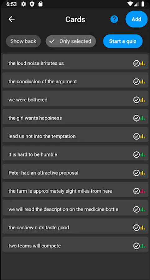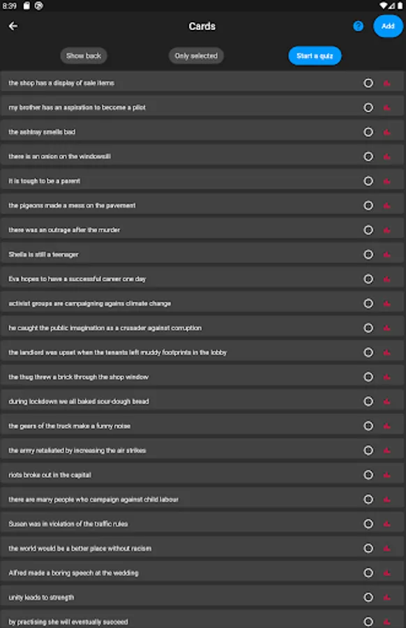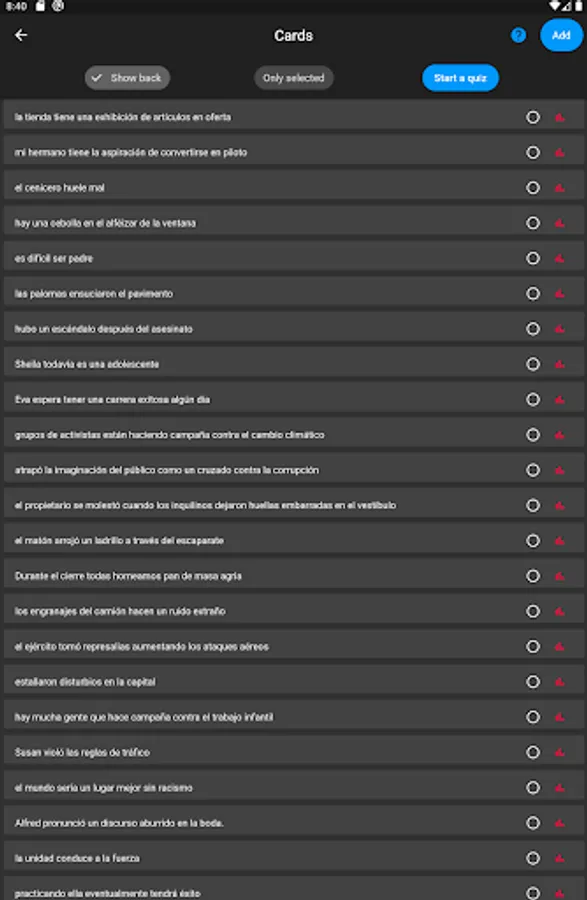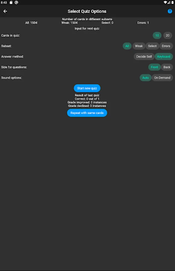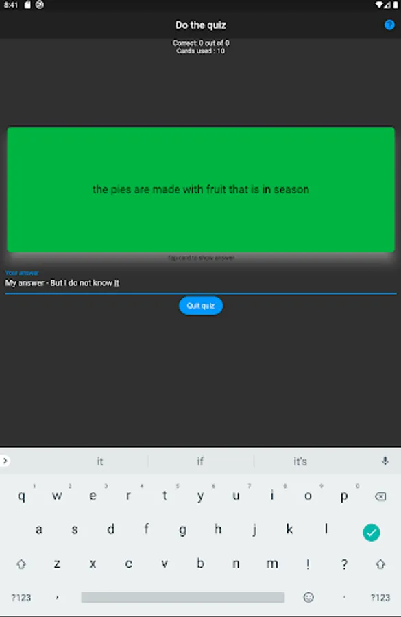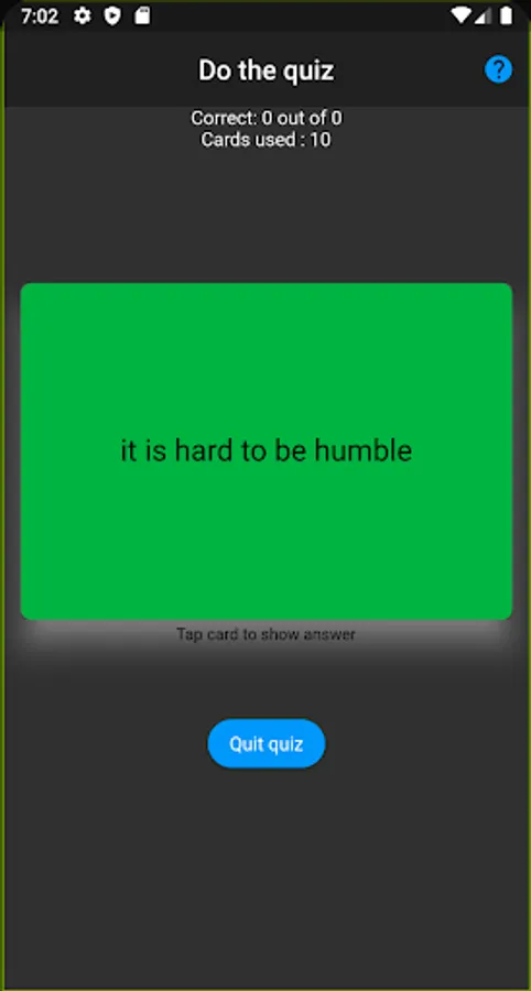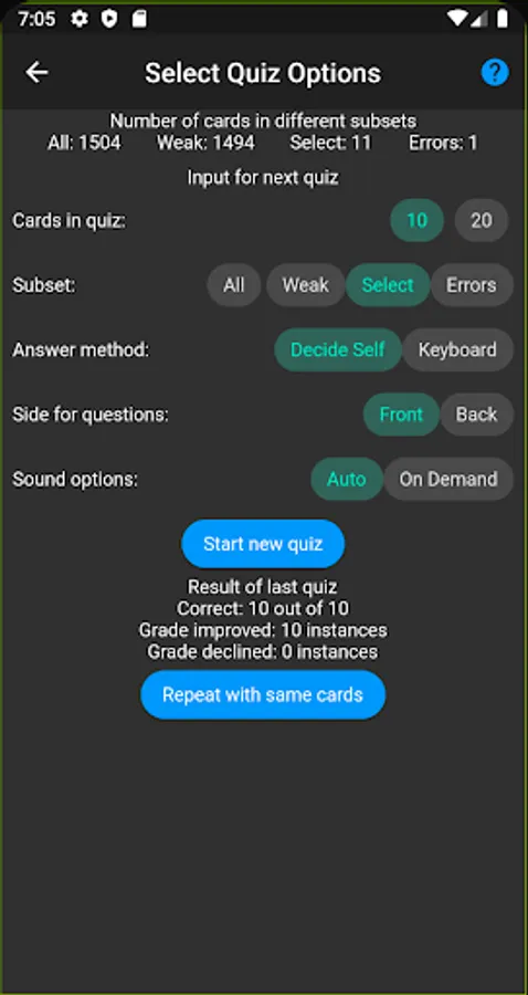 A grading system is incorporated whereby cards that were translated correctly in the quizzes get a higher grade. The user should repeat the quizzes to get as many as possible cards at the highest grade.