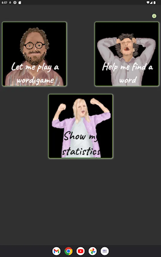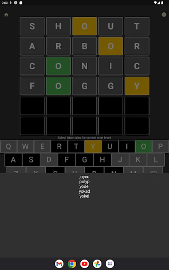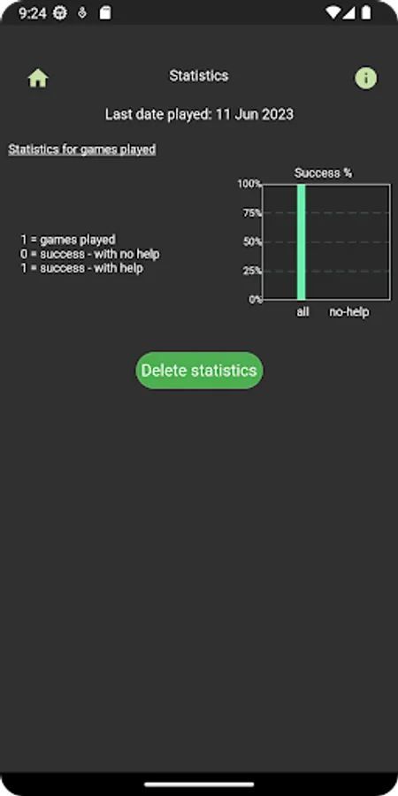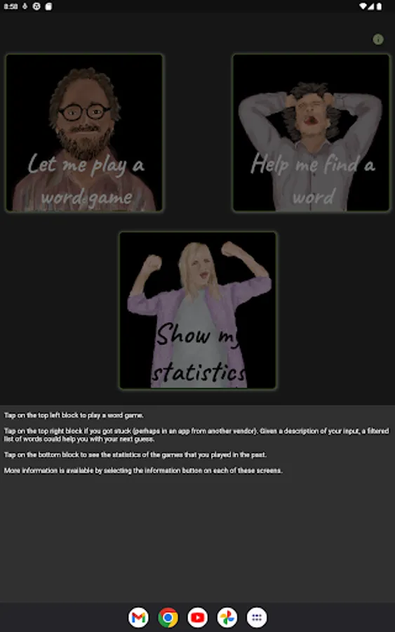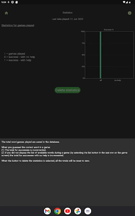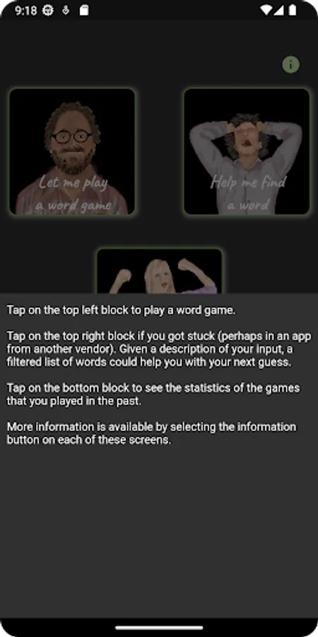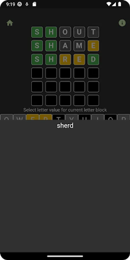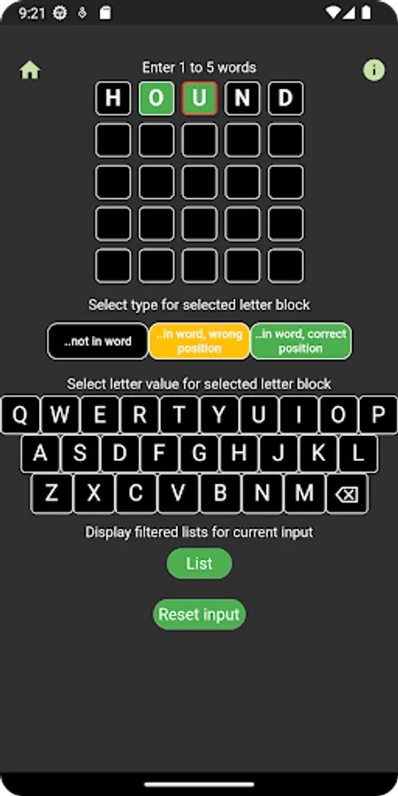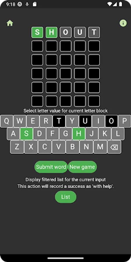 The app also has the capability to give you a filtered list of words that you can use, based on your current guesses. You could therefore never lose a word game. But it would be better to use self-discipline and solve the puzzle without help - that would increase your statistics for successes without help.