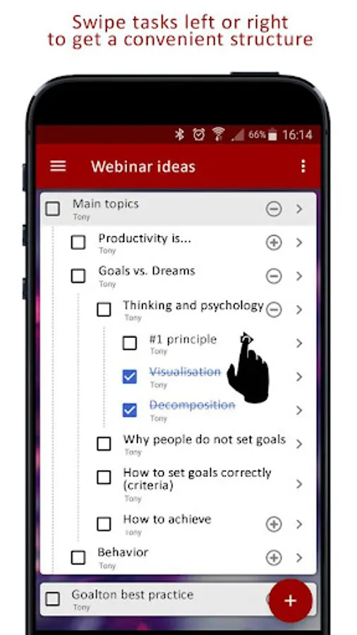 Goalton outliner was designed to keep you on top of your to-do list and calendar each and every day with no hassle. Thanks to the intuitive drag and drop of tasks, swiping to mark to-do's as complete in weekly planner - you can keep yourself organized and enjoy every minute of it. Goalton is a to-do list, a planner, a calendar, an outliner, a notepad, a checklist, task list, a board for post its or sticky notes, a project management tool, a reminders app, a daily planner, a family organizer, and overall the simplest and most useful productivity tool you will ever have. Best of all – it’s free for basic use!