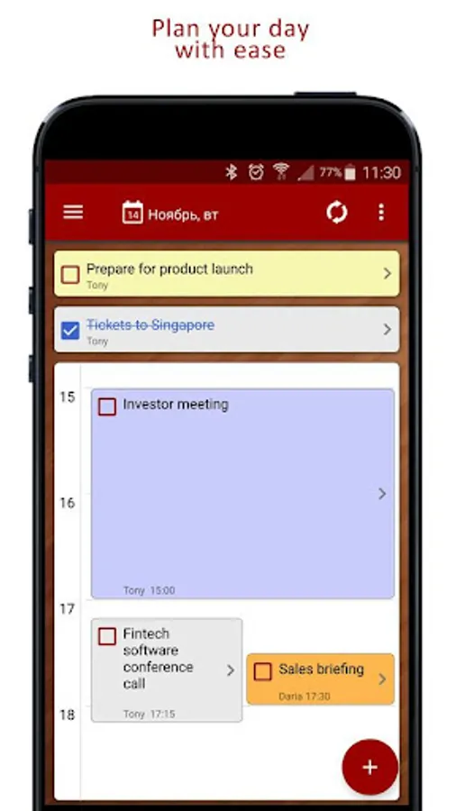 For professional users, our to-do list is convenient because tasks can be performed not only through the built-in calendar planner, but also using the kanban methodology. In this case each task or note has a stage of its execution. If you use the cloud service, then in the task or note's properties you will also have the "contact" field, so you can bind the task from the list to a specific organization and track it in built-in CRM system.