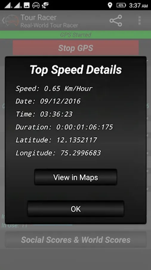 7. Once the destination is reached, tap the "Stop GPS" button within the Tour Racer.