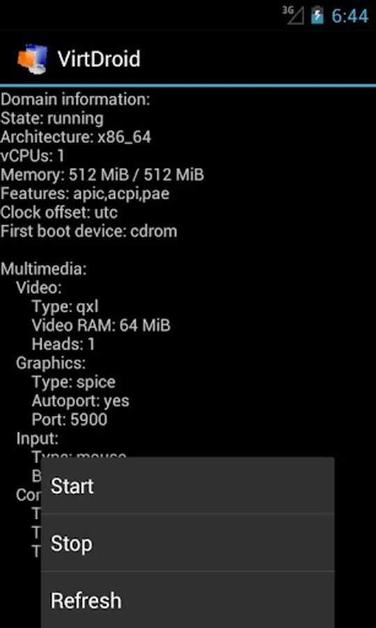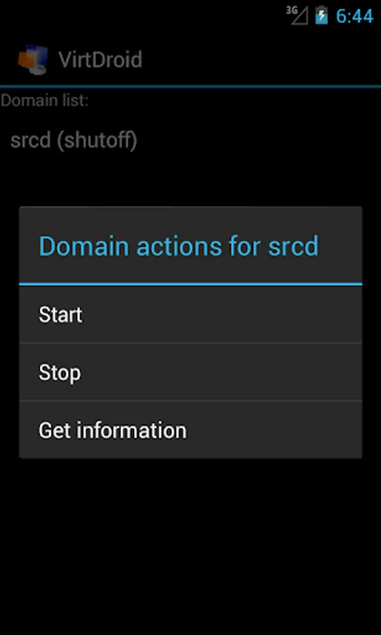VirtDroid is Virtual Machine Controller tool for Android operating systems to allow your Android device to connect to php-virt-control instance over the XML-RPC. This is useful for e.g. starting and/or stopping your virtual machines even when you're not having access to the computer but you have the public IP address of the server node and you have access to any WiFi network or you can use 3G connection.
