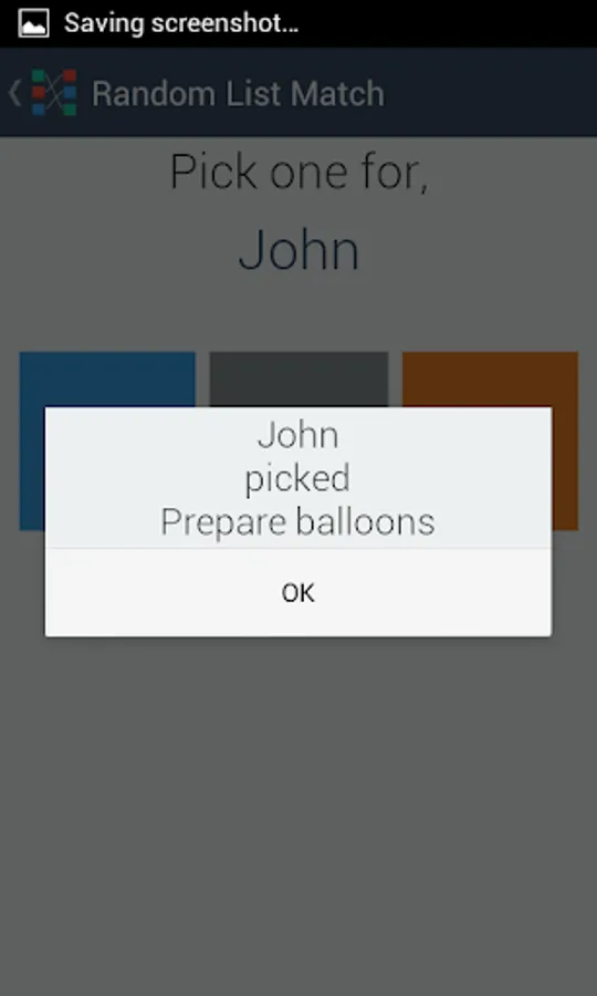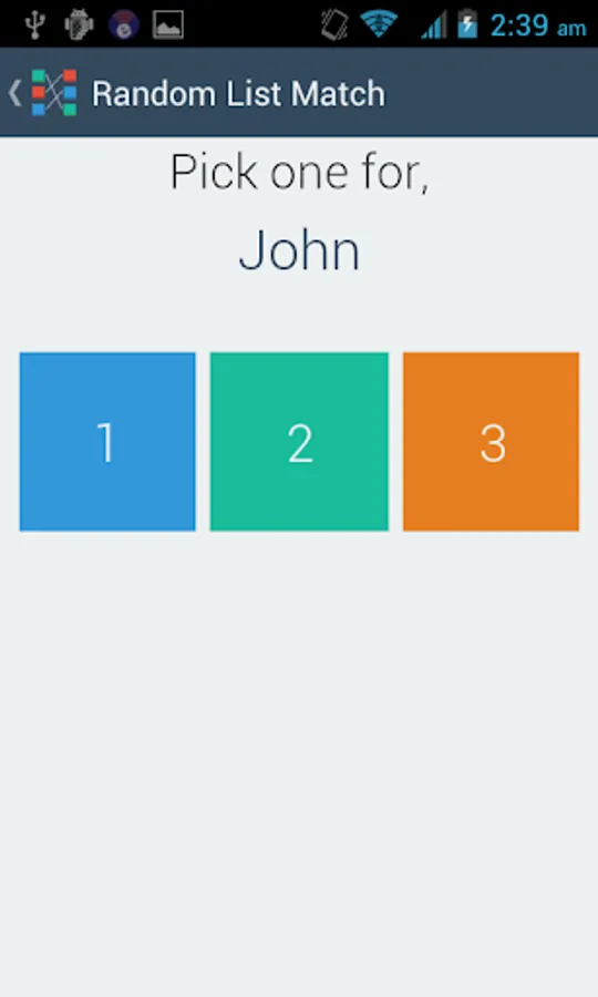 4a. If "Pick manually" is chosen, the app will display randomly ordered boxes representing the second list. The app will prompt entries in the first list to take turns to pick.