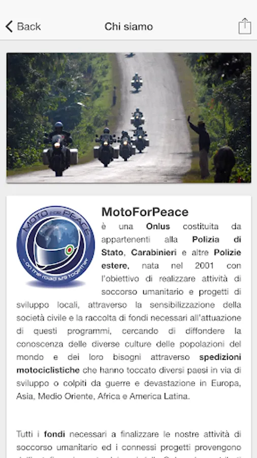 MotoForPeace is a non-profit organization made up of members of the State Police, Carabinieri and other foreign police forces, created in 2001 with the aim of creating humanitarian relief activities and local development projects, by raising awareness of civil society and raising necessary funds to 'implementation of these programs, trying to raise awareness of the different cultures of the world populations and their needs through motorcycle expeditions that have touched several countries in developing or affected by war and devastation in Europe, Asia, Middle East, Africa and Latin America.