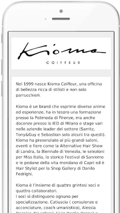 Kioma is a brand that expresses different souls and experiences, has treasure training at Polimoda in Florence, but also lectures at IED in Milan and stages various in industry leaders (Sarritz, Tony & Guy and Sebastian just a few of these). Kioma attended to larger halls, events and exhibitions such as the Alternative Hair Show in London, the Venice Biennale, the selections for Miss Italy, the historical Sanremo Festival and the platforms of the social life of Capri and Hair Stylist for Shop Gallery Danilo Fedrighi.