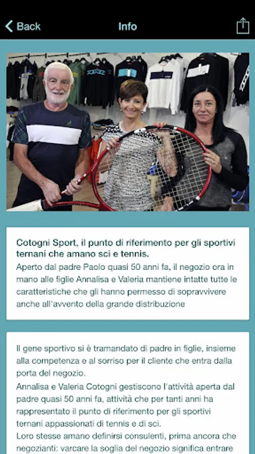 Cotogni Sport, the benchmark for sports Terni who love skiing and tennis. Opened in Terni, from his father Paolo almost 50 years ago, the shop now in the hands of Anna and Valeria daughters retains all the characteristics that have allowed him to survive the advent of supermarkets. If after almost half a century Cotogni Sport remains an institution in its field the reason lies not only in the supply and quality of products sold, but also in what customers find when they cross the threshold of the shop: smile, courtesy, helpfulness. "For us to sell has never meant only to give the customer his shoes or his racket, but it also means to make him feel at ease."