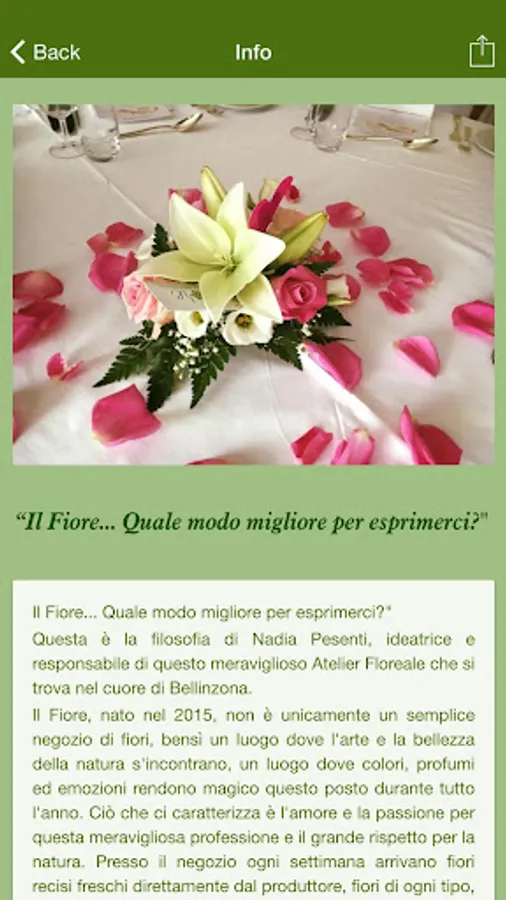 Flower ... What better way to express ourselves? "This is the philosophy of Nadia Pesenti, creator and manager of this wonderful Atelier Floral is located in the heart of Bellinzona. The Fiore, born in 2015, is not only a simple shop flowers, but a place where art and beauty of nature come together, a place where colors, scents and emotions make this magical place throughout the year. what characterizes us is our love and passion for this wonderful profession and great respect for nature. at the shop every week arrive fresh cut flowers directly from the manufacturer, flowers of all kinds, from the most classic to the most particular, all the flowers are selected and individually inspected to ensure greater security to the customer. also you can find plants of all kinds, classical as well as special plants (rare), green or flowering plants, indoor and outdoor.