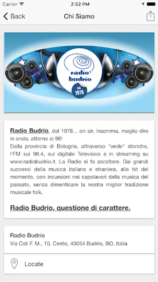 From the province of Bologna, through "waves" historical, 98.4 on the FM, on digital Television and streamed on www.radiobudrio.it. The radio will hear you. From the great successes of Italian and foreign music, the hit of the moment, with incursions in the masterpieces of music of the past, without forgetting our best folk music tradition. Radio Budrio, question of character.