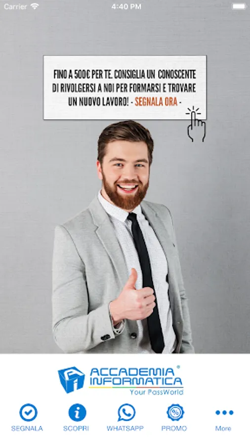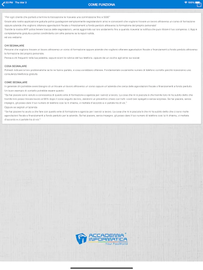 With Accademia Informatica, word of mouth is rewarded! Thanks to our free application you can earn simply by referring friends and acquaintances who want to find a job through a training course or companies that want to get tax breaks or non-repayable loans through the training of their staff! Through our APP you can keep track of the reports, you will be updated on their progress until you receive the notification that you can collect your compensation. The App is completely free and you can share it with other people if you consider it valid. We are very pleased to see you in our network of referrers to work together and earn together. Accademia Informatica is a training institution and an agency for work services accredited to the Lazio Region, based in Rome, to promote professional training, retraining and updating of staff, start-up to work, through courses of training funded by public and / or private entities. It organizes courses, professional training activities, increasingly involving the business system, freelancers and young people, encouraging them to use Community, State, Regional and any local authority resources. Our goal is to add value to companies, implementing the skills of their staff and supporting them in the transmission of knowledge, to increase their professionalism and competitiveness mainly on the ICT market. Our services at work assist people throughout the process of accompanying them to work, allowing people to meet different companies in order to find the one corresponding to their skills.