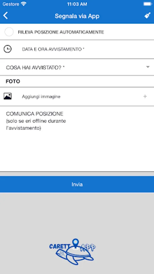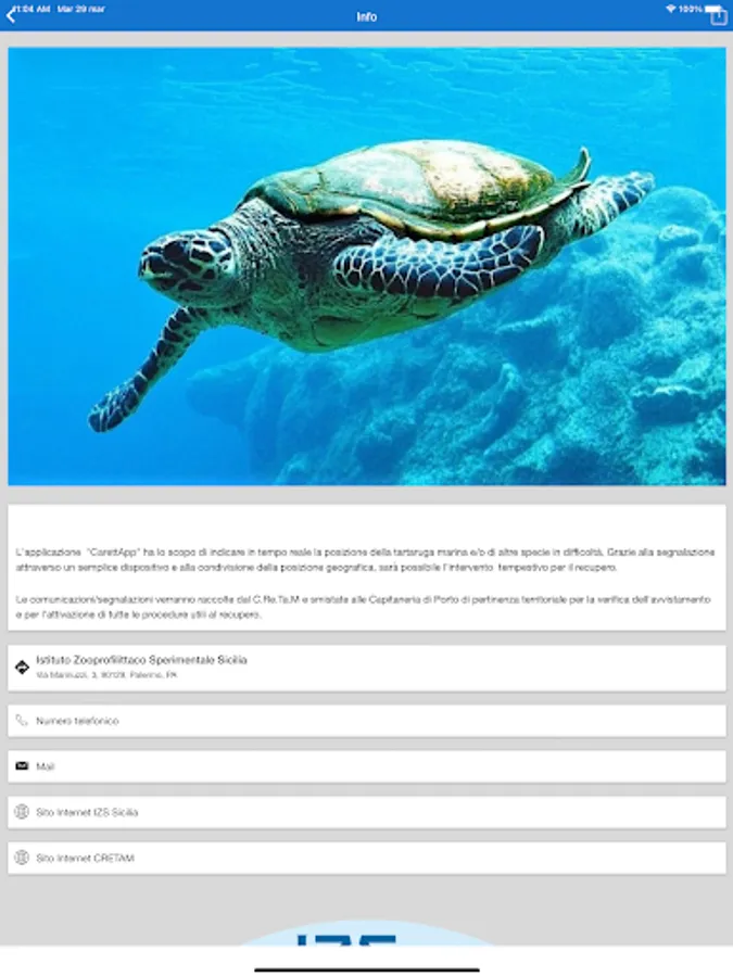 CarettApp is an App that serves to report turtles and other marine species that are sighted while sailing in the sea. The project was carried out by the Experimental Zooprophylactic Institute of Sicily in collaboration with Migastone.