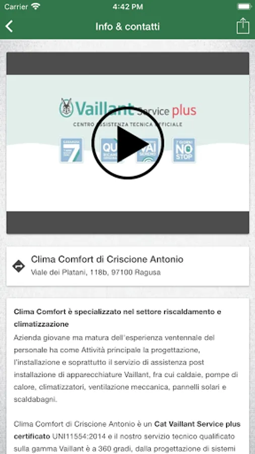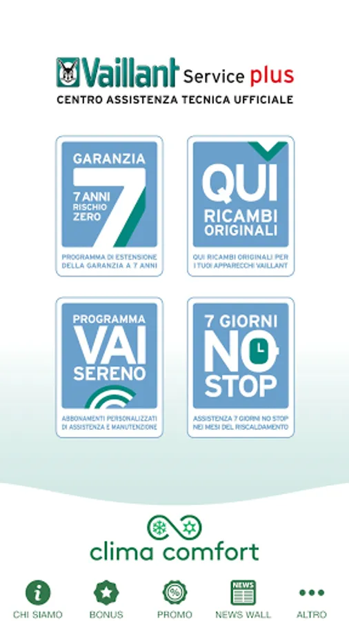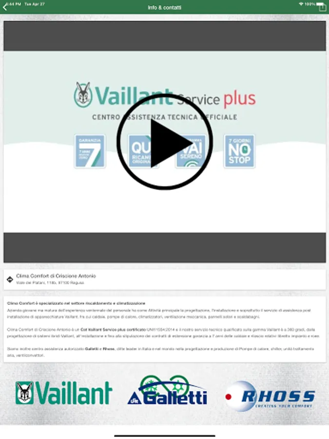 A young but mature company with twenty years of staff experience, its main activity is the design, installation and above all the post-installation assistance service of Vaillant equipment, including boilers, heat pumps, air conditioners, mechanical ventilation, solar panels and water heaters. Clima Comfort by Criscione Antonio is a Cat Vaillant Service plus certified UNI11554: 2014 and our qualified technical service on the Vaillant range is at 360 degrees, from the design of Vaillant hybrid systems, to installation and up to the stipulation of warranty extension contracts to 7 years of the boilers and release of the related plant and rcee booklet. Clima Comfort of Criscione is also authorized assistance center Galletti and Rhoss, lidear companies in Italy and in the world in the design and production of heat pumps, chillers, air handling units, fan coils.