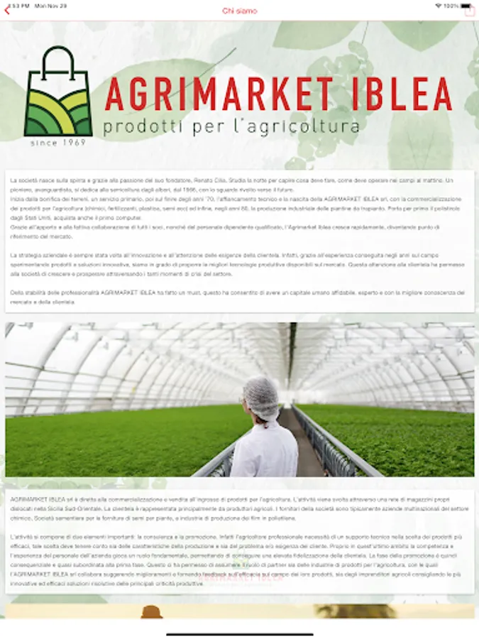 AGRIMARKET IBLEA srl is aimed at the marketing and wholesale of agricultural products. The activity is carried out through a network of own warehouses located in South-Eastern Sicily. The clientele is mainly represented by agricultural producers. The company's suppliers are typically multinational chemical companies, seed companies for plant seed supplies, and polyethylene film manufacturing industries. The activity consists of two important elements: advice and promotion. In fact, the professional farmer needs technical support in choosing the most effective products, this choice must take into account both the characteristics of the production and the problem and / or need of the customer. Precisely in the latter area, the competence and experience of the company's staff plays a fundamental role, allowing to achieve a high level of customer loyalty. The promotion phase is therefore consequential and almost subordinate to the first phase. This has allowed us to take on the role of partner both of the agricultural product industries, with which AGRIMARKET IBLEA srl collaborates by suggesting improvements and providing feedback on the effectiveness of their products in the field, and of agricultural entrepreneurs recommending the most innovative and effective solutions for the main production problems.