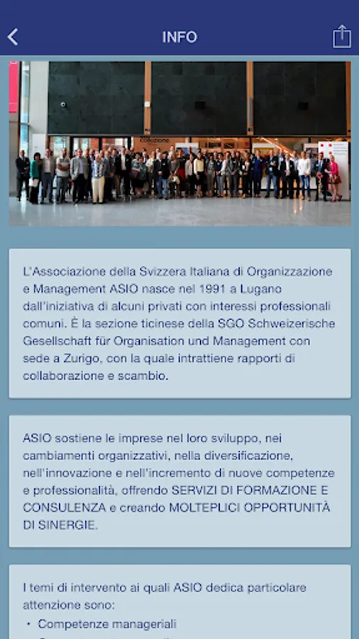 The Association of Italian Switzerland of Organization and Management ASIO was founded in 1991 in Lugano by the initiative of some private individuals with common professional interests. It is the Ticino section of the SGO Schweizerische Gesellschaft für Organization and Management based in Zurich, with which it maintains relationships of collaboration and exchange.