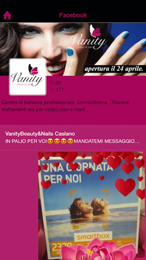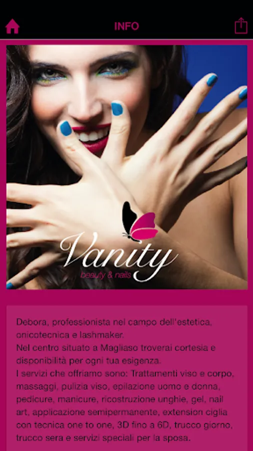 The services we offer are: Face and body treatments, massages, facial cleansing, man and woman hair removal, pedicure, manicure, nail reconstruction, gel, nail art, semi-permanent application, eyelash extensions with one to one technique, 3D up to 6D, makeup day, evening makeup and special services for the bride.