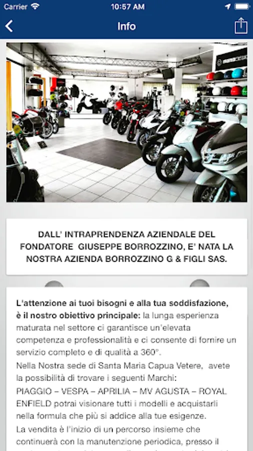 Attention to your needs and your satisfaction is our main objective: the long experience gained in the sector guarantees us high competence and professionalism and allows us to provide a complete and quality service at 360 °. In our headquarters in Santa Maria Capua Vetere, you can find the following brands: PIAGGIO - VESPA - APRILIA - MV AGUSTA - ROYAL ENFIELD you can view all the models and buy them in the formula that best suits your needs. The sale is the beginning of a journey together that will continue with periodic maintenance, at our service center, in the expert hands of our constantly updated specialists. You will also find the following brands that you can buy, even online, in our shop: www.borrozzinoshop.it ORIGINAL PIAGGIO ACCESSORIES AND SPARE PARTS - VESPA MOMO DESIGN - TUCANO URBANO - VESPA - AIROH - LS2 - SIDI CELLULAR LINE - FABBRI - ORIGIN - CGM We're 500m from the SANTA MARIA CAPUA VETERE motorway exit, from the NORTH after CAPUA and from the SOUTH after CASERTA NORD. We are waiting for you at the Dealership. The staff of BORROZZINO G E FIGLI SAS.