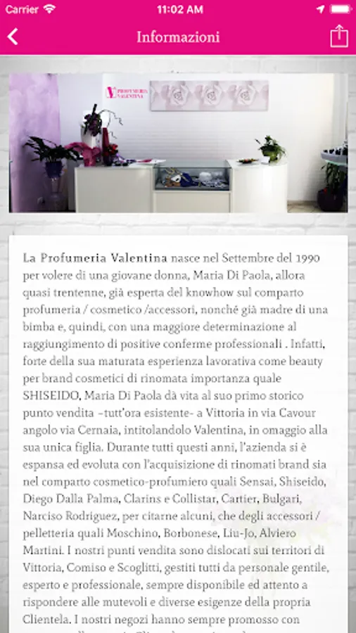 The Valentina Perfumery was born in September 1990 at the behest of a young woman, Maria Di Paola, then almost thirty years old, already expert in the know-how in the perfumery / cosmetic / accessories sector, as well as the mother of a child and, therefore, with a greater determination to achievement of positive professional confirmations. In fact, thanks to her experience gained as a beauty for renowned cosmetics brands such as SHISEIDO, Maria Di Paola gives life to her first historic store - still existing - in Vittoria in via Cavour at the corner of via Cernaia, entitled Valentina, as a tribute to his only daughter. During all these years, the company has expanded and evolved with the acquisition of renowned brands both in the cosmetic-perfume sector such as Sensai, Shiseido, Diego Dalla Palma, Clarins and Collistar, Cartier, Bulgari, Narciso Rodriguez, to name a few, than accessories / leather goods such as Moschino, Borbonese, Liu-Jo, Alviero Martini. Our sales outlets are located in the territories of Vittoria, Comiso and Scoglitti, all managed by polite, experienced and professional staff, always available and attentive to responding to the changing and diverse needs of their customers. Our stores have always successfully promoted new trends to their customers through an unchanging and rewarding sales policy characterized by friendly cordiality in the relationship approach. In our stores there are no owners or leaders, but only expert people, united and motivated by a common priority goal such as the satisfaction of their customers, in the best and economically advantageous way in the quality / price ratio