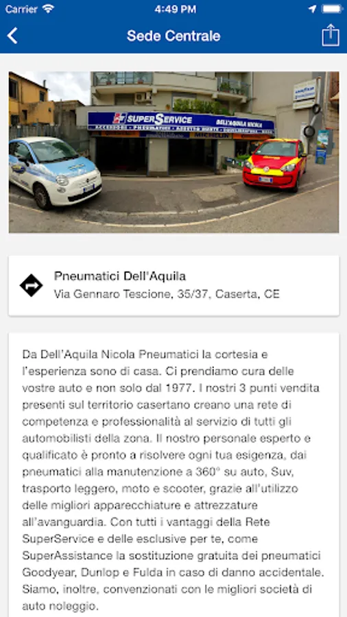 At Dell’Aquila Nicola Pneumatici courtesy and experience are at home. We take care of your cars and not only since 1977. Our 3 stores in the Caserta area create a network of competence and professionalism at the service of all motorists in the area. Our experienced and qualified staff is ready to solve all your needs, from tires to 360 ° maintenance on cars, SUVs, light transport, motorcycles and scooters, thanks to the use of the best state-of-the-art equipment and equipment. With all the advantages of the SuperService Network and exclusives for you, such as SuperAssistance, the free replacement of Goodyear, Dunlop and Fulda tires in case of accidental damage. We are also affiliated with the best car rental companies.