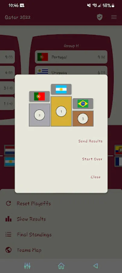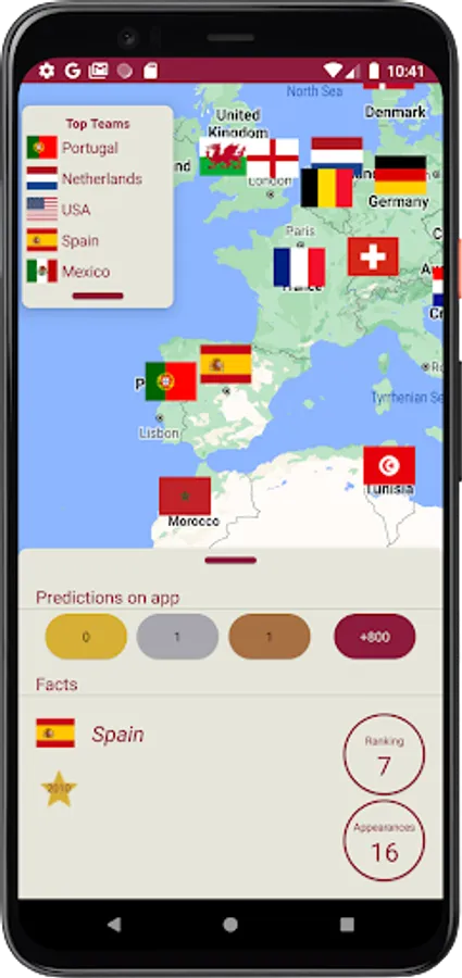 The map screen will show you fun facts of participant countries. Also, if you login, you will be able to see the top teams with best predictions on the app. This list can be moved around if it disrupt your view of the map.